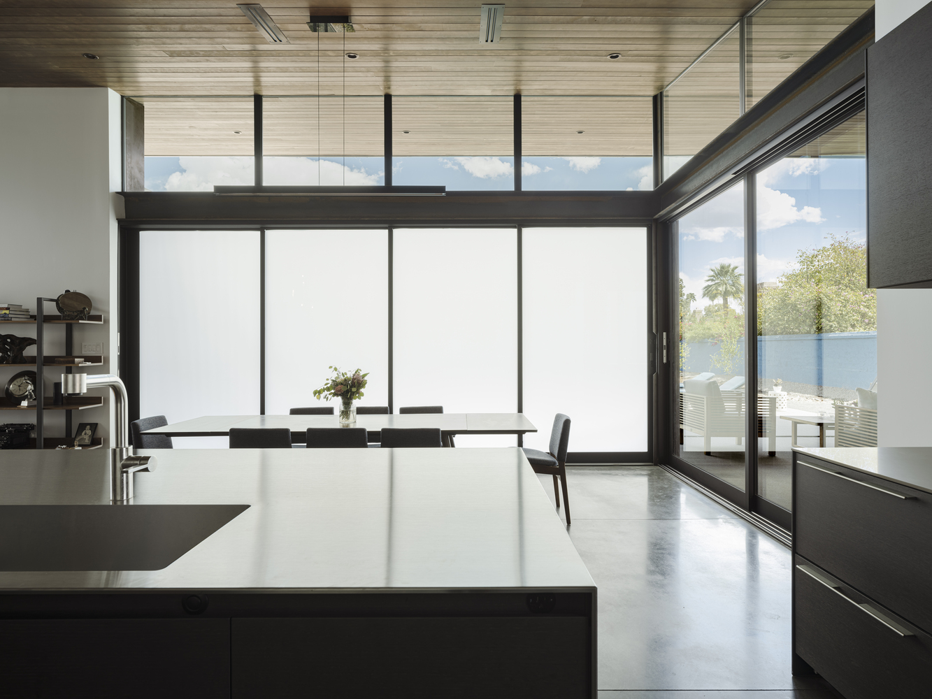Cửa kính được trang bị Gauzy—một công nghệ kính nano điều khiển ánh sáng, cho phép kính thay đổi độ trong suốt để đảm bảo riêng tư cho các thành viên trong gia đình.