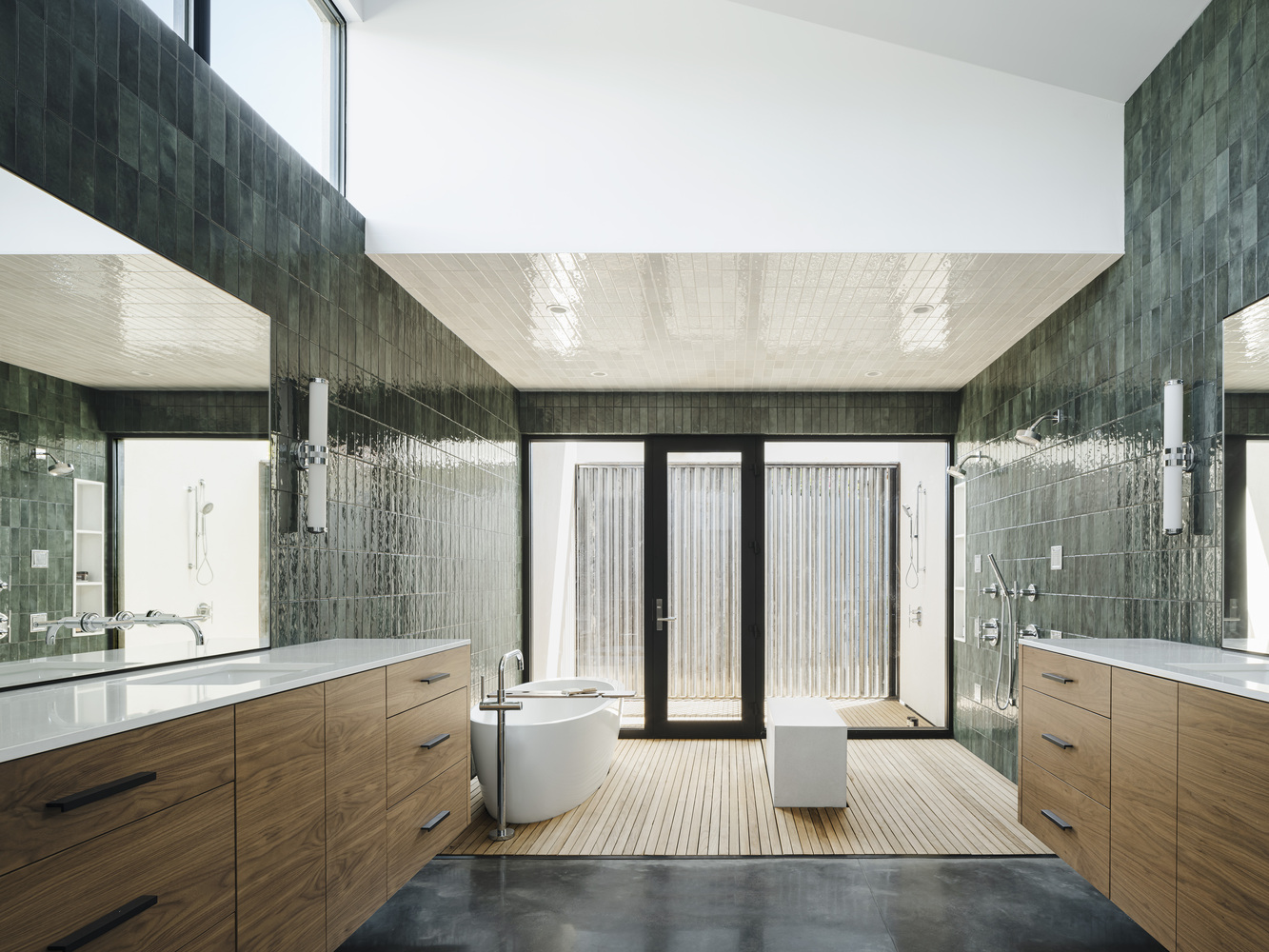 Ở cuối ngôi nhà, xa ra khỏi sự hối hả và nhộn nhịp của đại gia đình dưới mái nhà chung Big Top là một khu vực phòng tắm sang trọng. Bồn tắm và vòi sen được chiếu rọi bởi ánh sáng tự nhiên, lại còn kết nối với một vòi hoa sen ngoài trời được ngăn cách với khu vực bên ngoài bằng một bức tường thép tùy chỉnh.