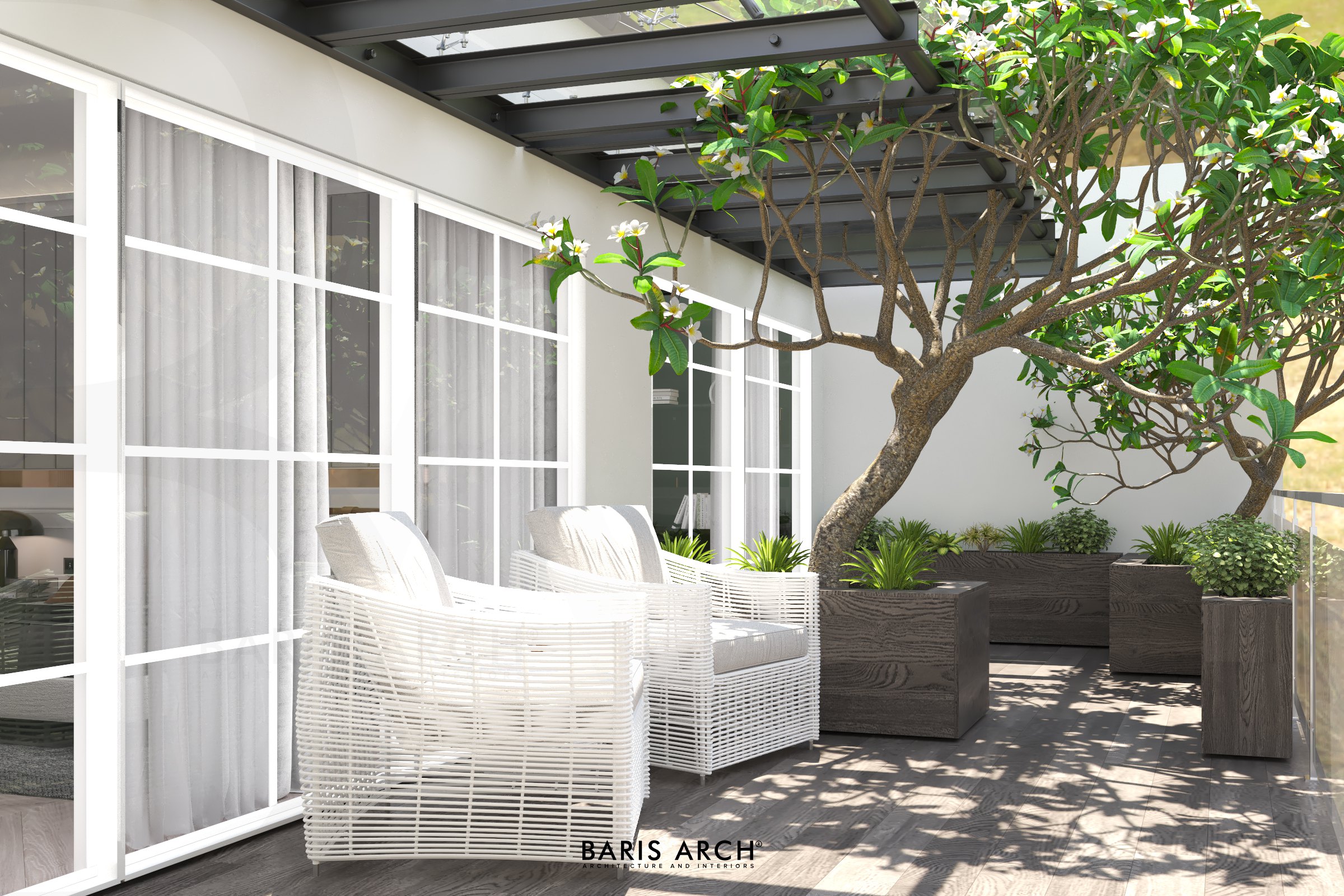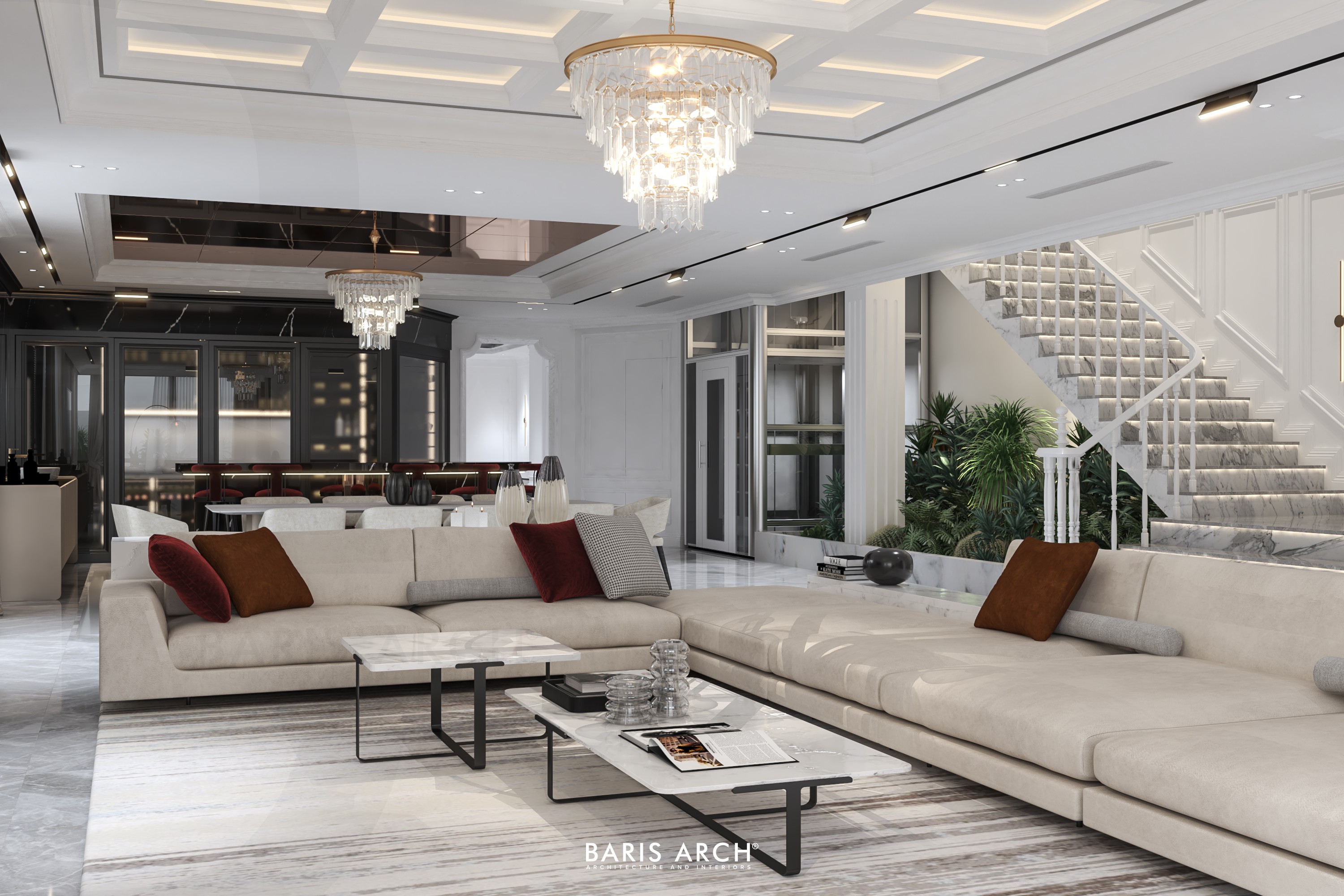 Căn villa 3 tầng có diện tích hơn 700m2 là nơi lý tưởng để tích hợp nhiều không gian giải trí cho cả gia đình. Vì vậy, ngoài các khu chức năng cơ bản, Baris Arch và gia chủ đã đi đến nhiều phương án cho các tiện nghi khác như phòng chiếu phim, sân golf mini, terrace thư giãn hay BBQ ngoài trời. Bên cạnh đó, đưa ra thiết kế sân vườn sinh động và trải xuyên suốt theo cấu trúc phương ngang của ngôi nhà.