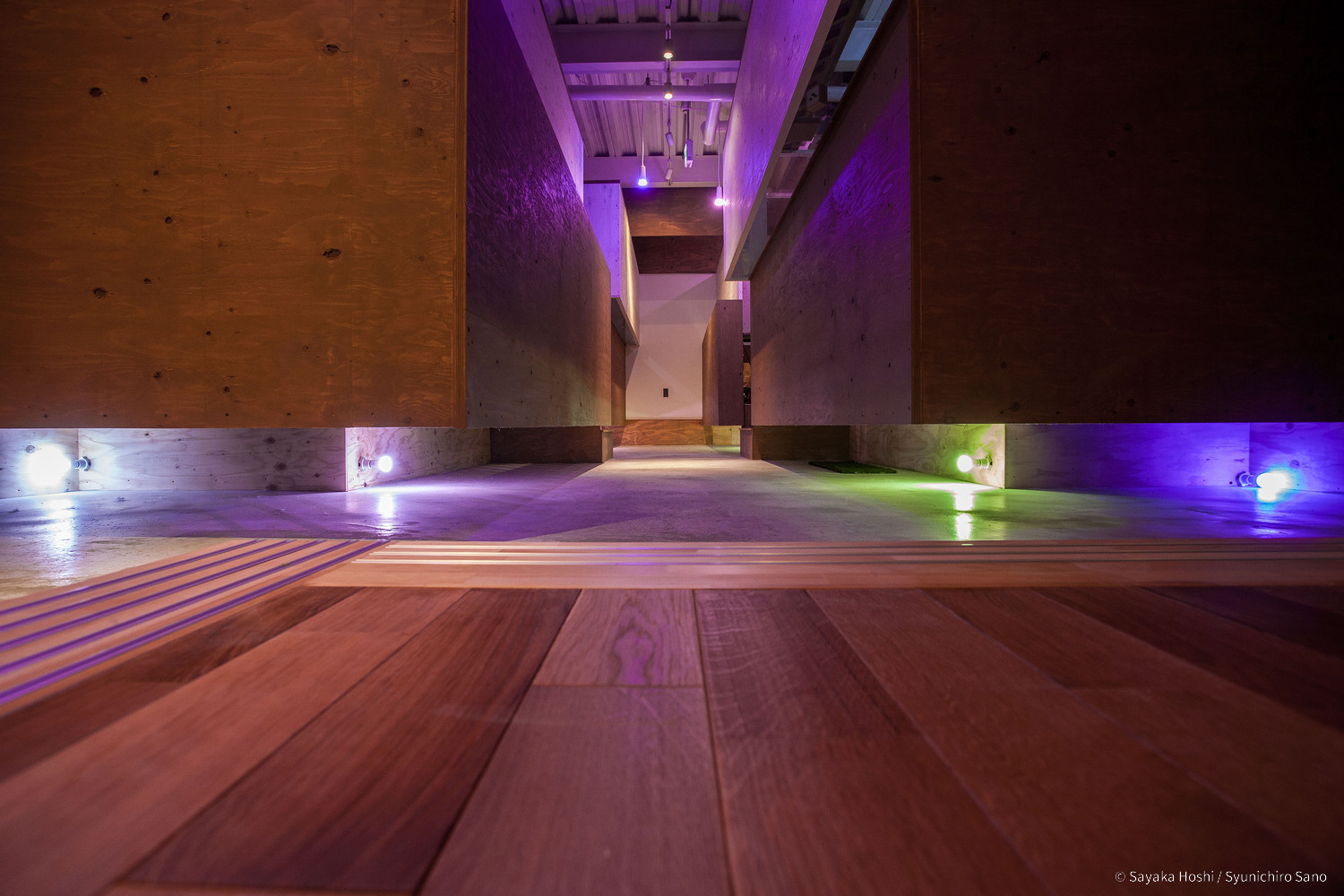 Furthermore, the walls are connected at staggered angles, allowing light to filter through the gaps, transitioning from outside to inside or vice versa depending on the light source's intensity. The lighting system is programmed to continuously create a gentle transition of colors, reflecting the changing nature of the environment despite the presence of artificial elements.