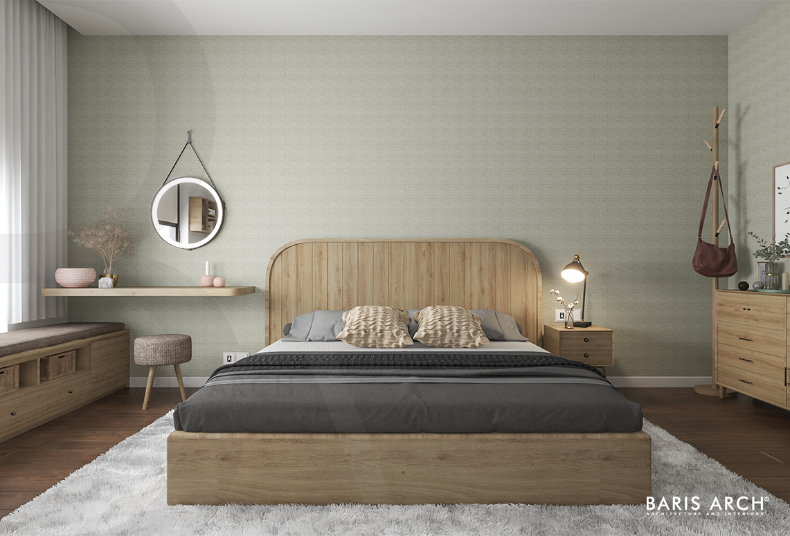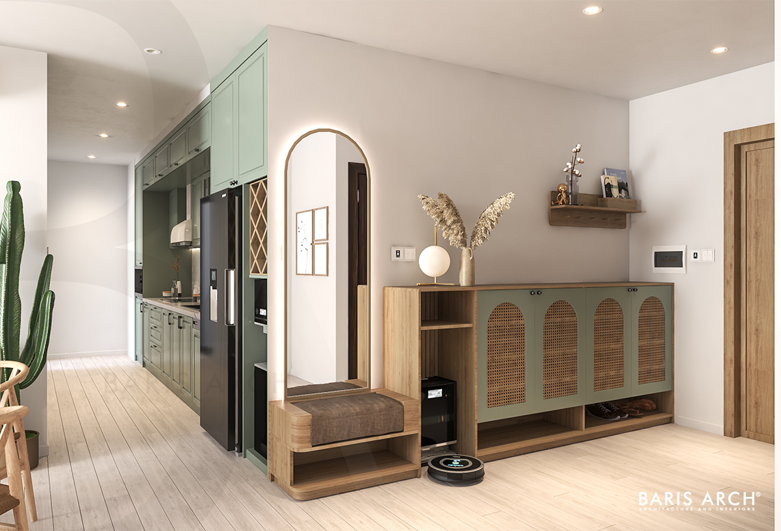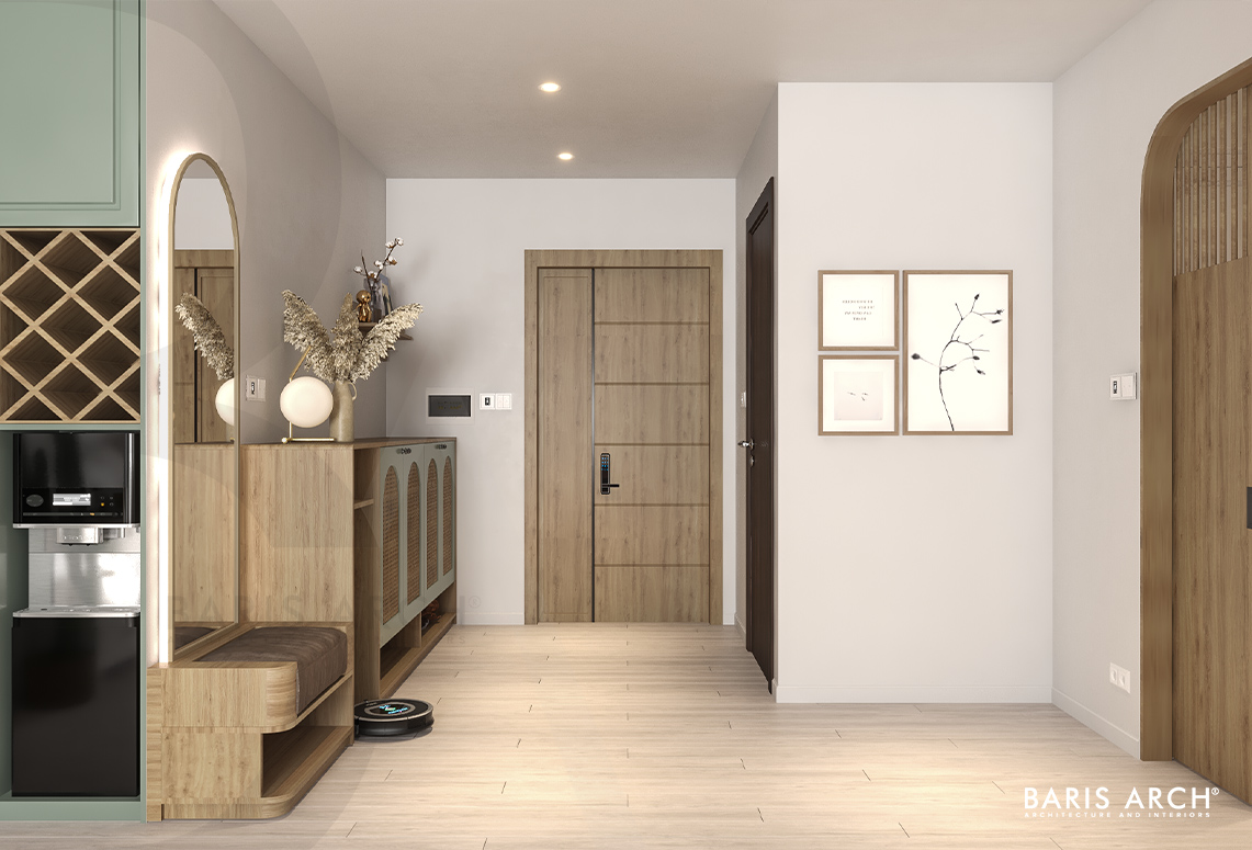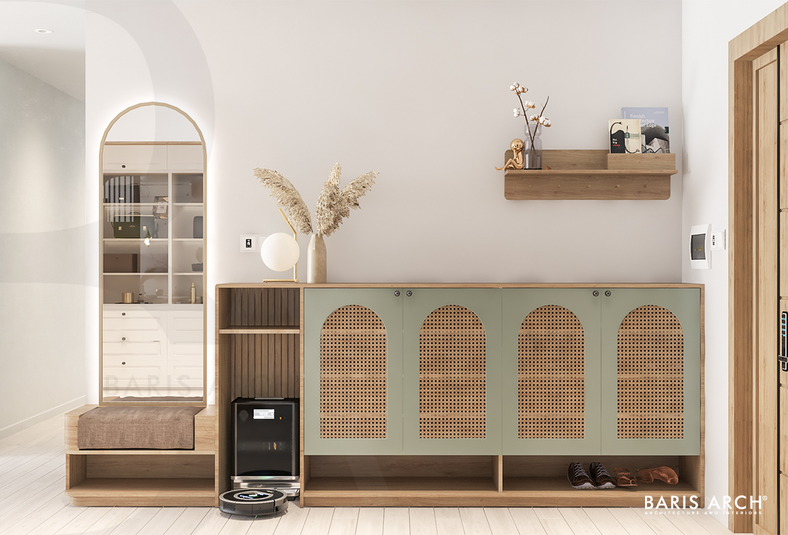 Chất mộc len lỏi mọi ngóc ngách của ngôi nhà từ bộ bàn ăn, tủ giày cánh mây đan hay các hệ tủ trong nhà. Dưới ánh sáng vàng ấm, những chi tiết đường cong của nội thất càng làm tăng thêm nét mềm mại, nữ tính của hai nữ chủ nhân. Cá tính riêng của mỗi người được lột tả trong chính không gian cá nhân của mỗi người - phòng ngủ. Với thiết kế phân chia không gian mạch lạc cùng sự đồng nhất trong thẩm mỹ, Baris Arch biến căn hộ trở nên hài hòa, giúp quá trình trải nghiệm của gia chủ trở nên mượt mà, thú vị hơn.