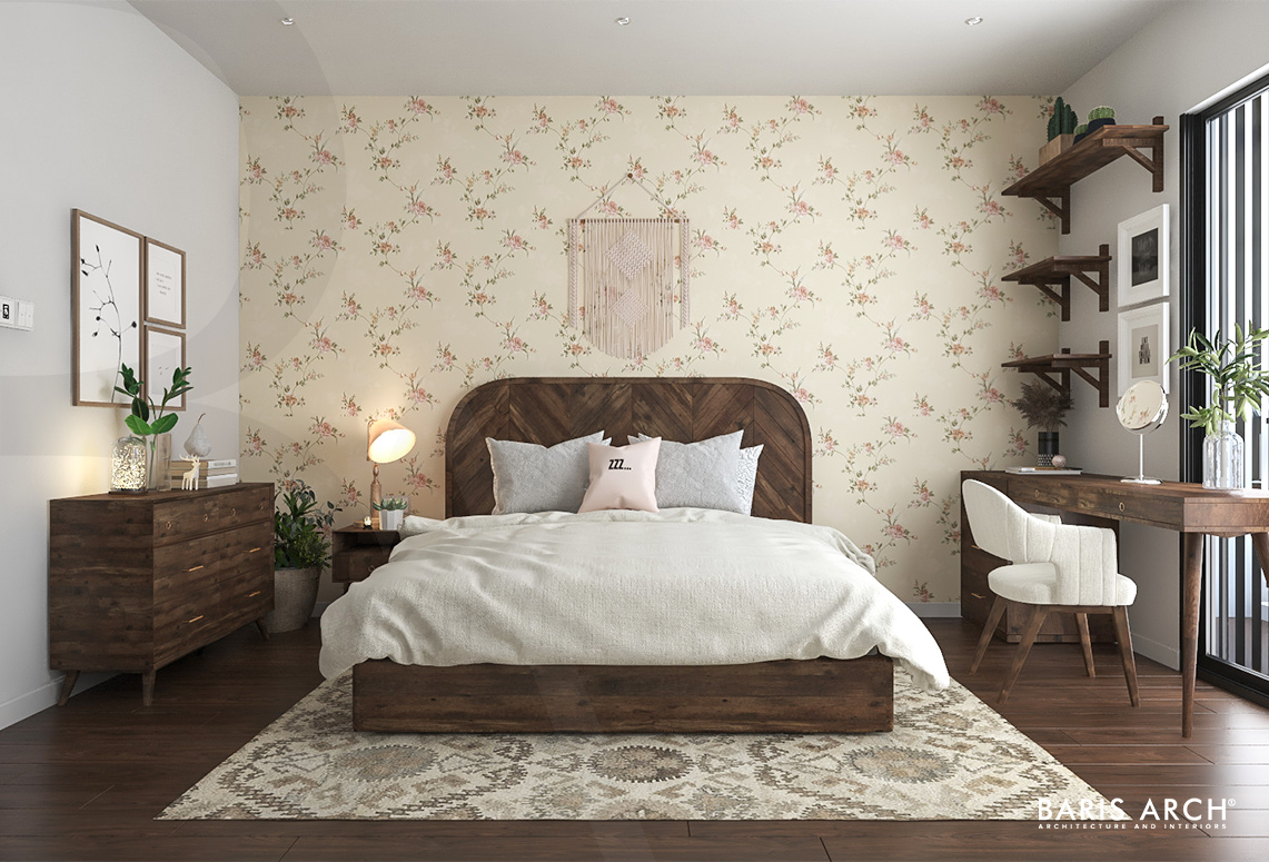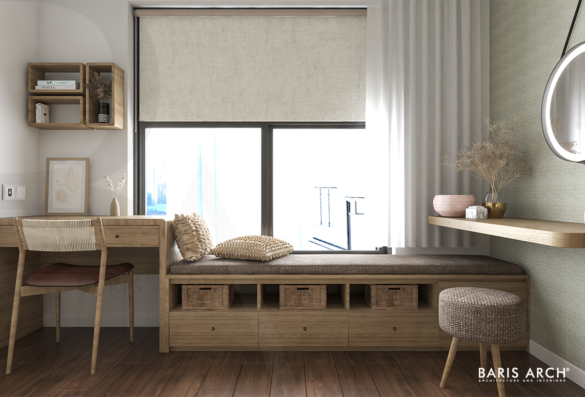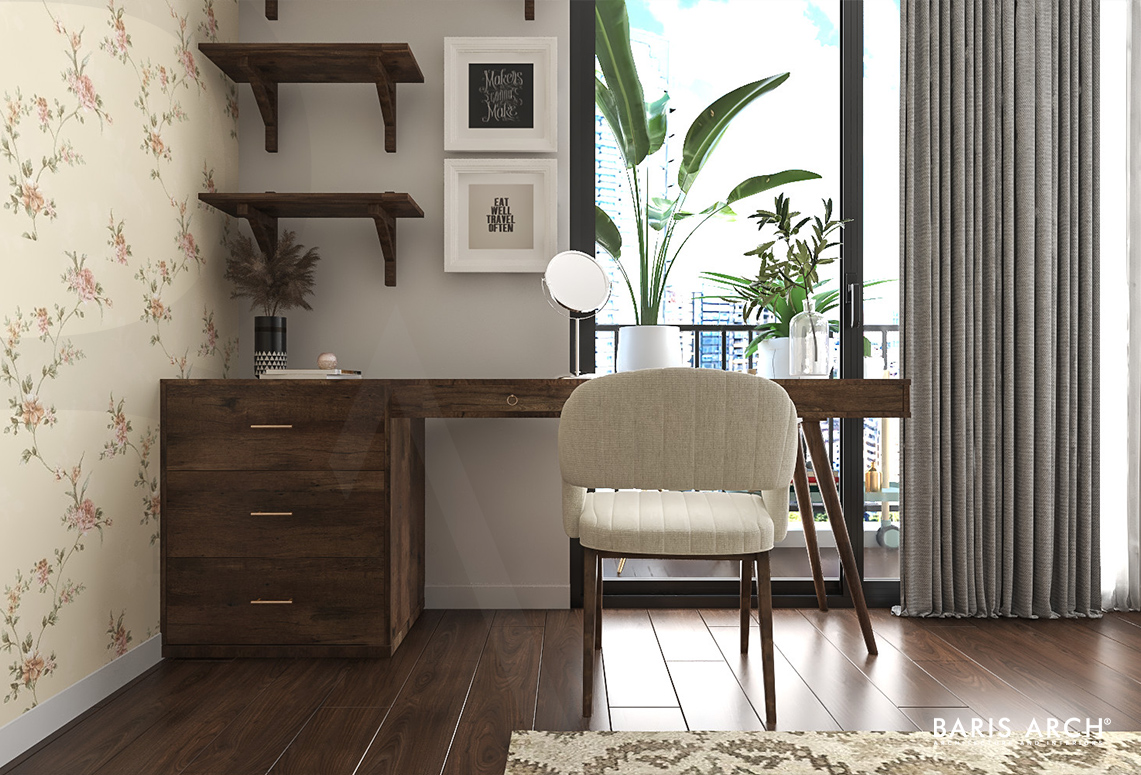 Phong cách Scandinavian với gam màu gỗ sáng được cô chị ưu ái chọn cho không gian riêng của mình, trong khi cô em gái chuộng phong cách Vintage với tông màu gỗ tối. Kết hợp sở thích hai chị em, Baris Arch đã thiết kế một không gian hiện đại pha lẫn nét tinh tế nhẹ nhàng với 2 màu nhấn nâu đậm, nâu sáng.