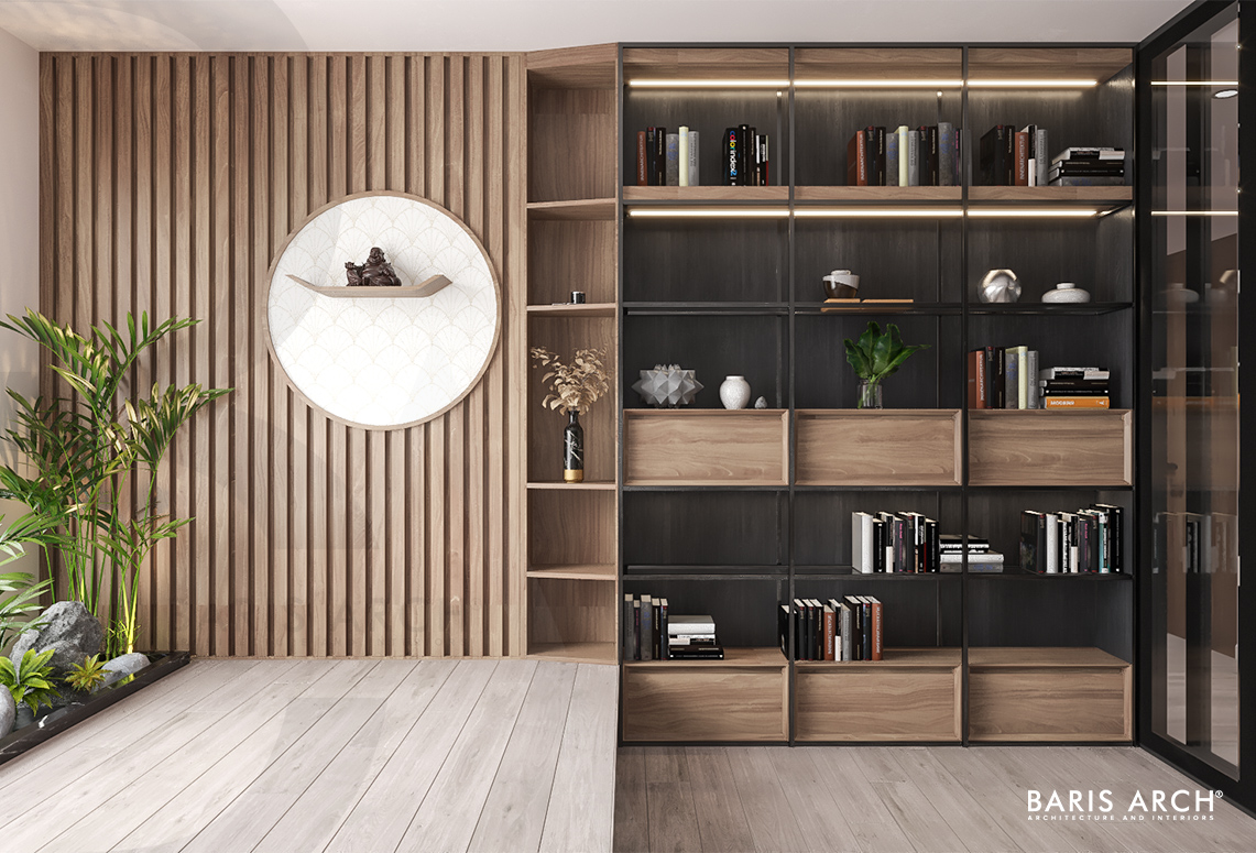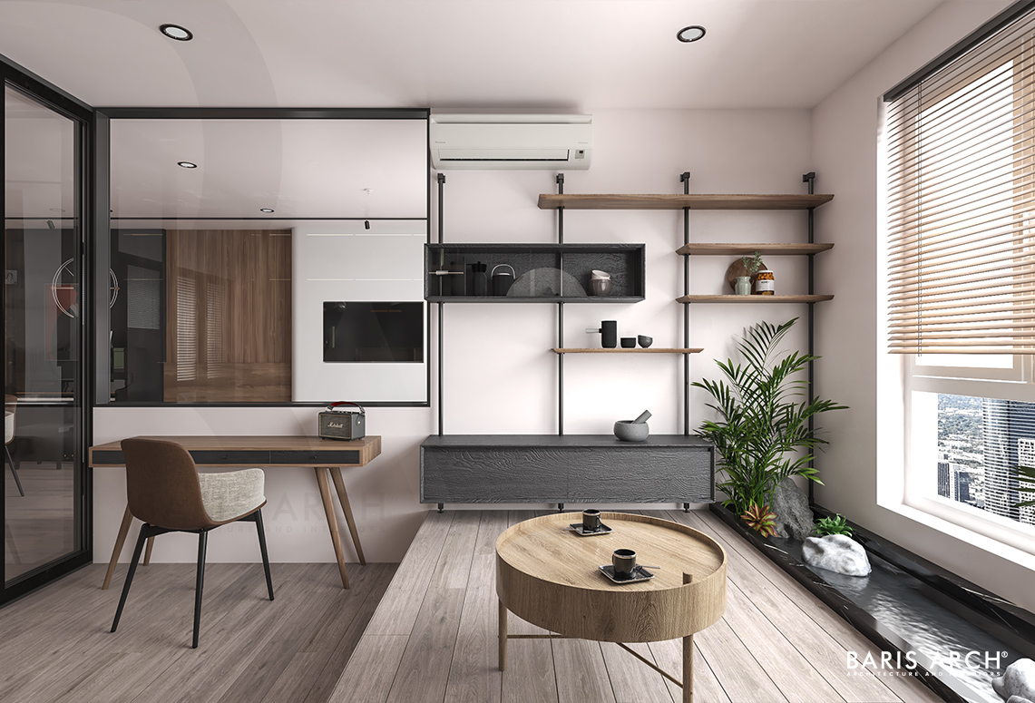 Đối với yêu cầu bố trí một không gian thưởng trà trong căn hộ phong cách đương đại, Baris Arch đã tạo nên một không gian giao thoa giữ truyền thống và hiện đại: phản gỗ ngồi thưởng trà bên cạnh tiểu cảnh xanh mướt như ngồi bên dòng suối trong veo. Kệ trà cụ với vân gỗ tinh tế, mang kiểu dáng hiện đại với những trụ kim loại đen nhưng không làm mất đi nét mộc mạc của tổng thể không gian.