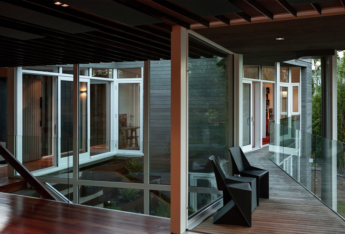 Thiết kế đầy tính sáng tạo thể hiện qua bức tường được dựng nên bằng các thanh gỗ thẳng tắp, sắp đặt theo quy tắc mang lại cảm giác vững chãi và chắc chắn nhất định cho ngôi nhà. Vách ngăn bằng kính khiến không gian luôn thoáng mát và tràn ngập ánh sáng, sẵn sàng để khung cảnh huyễn hoặc của biển bao trọn tầm nhìn ở mọi ngóc ngách.