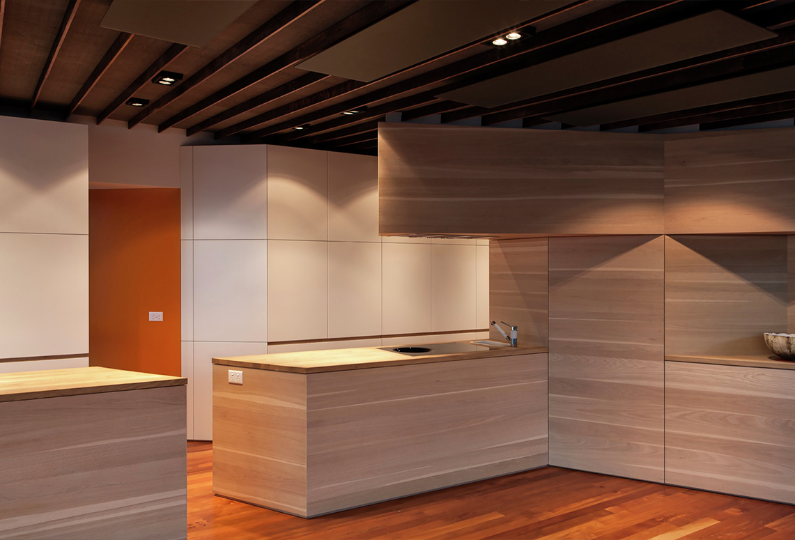 Các đường thẳng dứt khoát của phần nội thất kết hợp với xà ngang bằng gỗ của trần nhà góp phần tạo hiệu ứng thị giác ấn tượng.