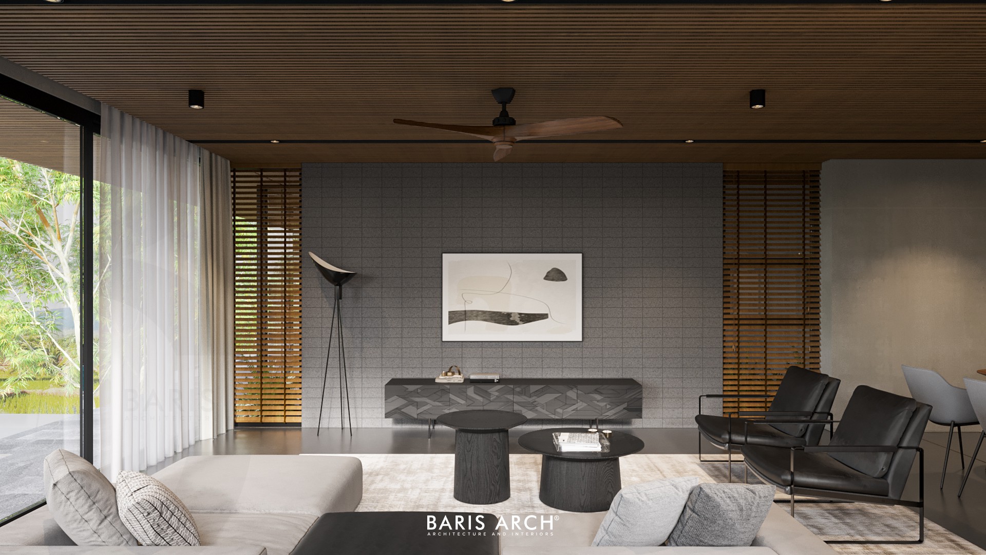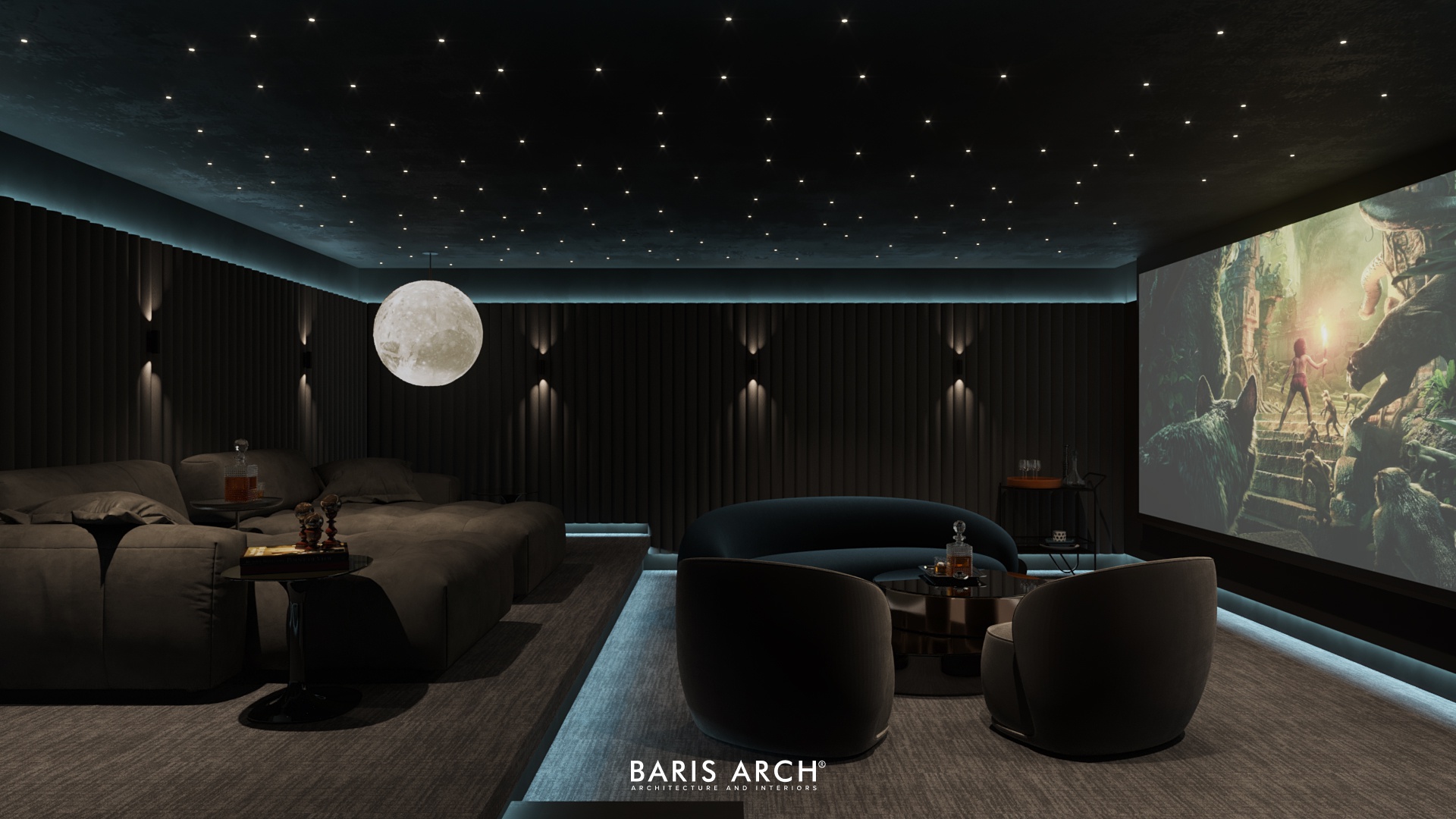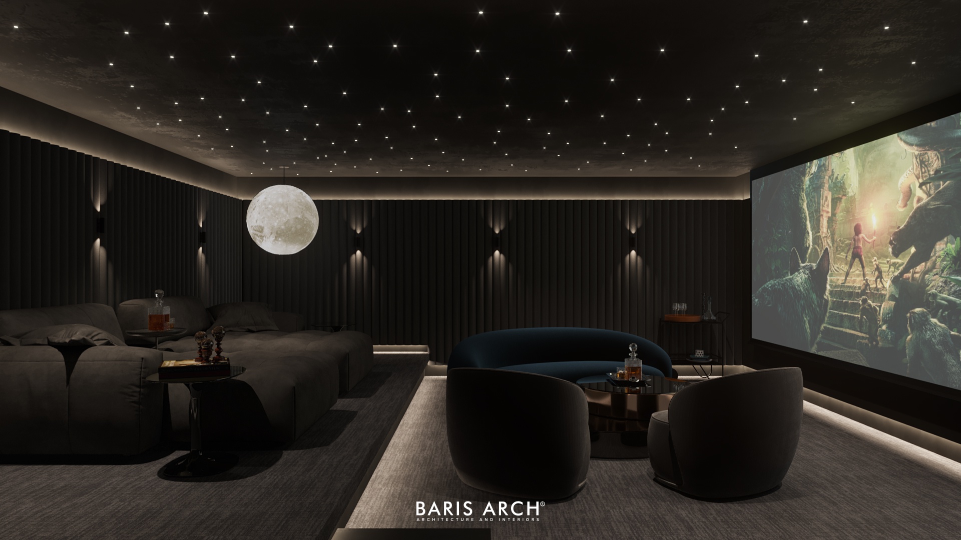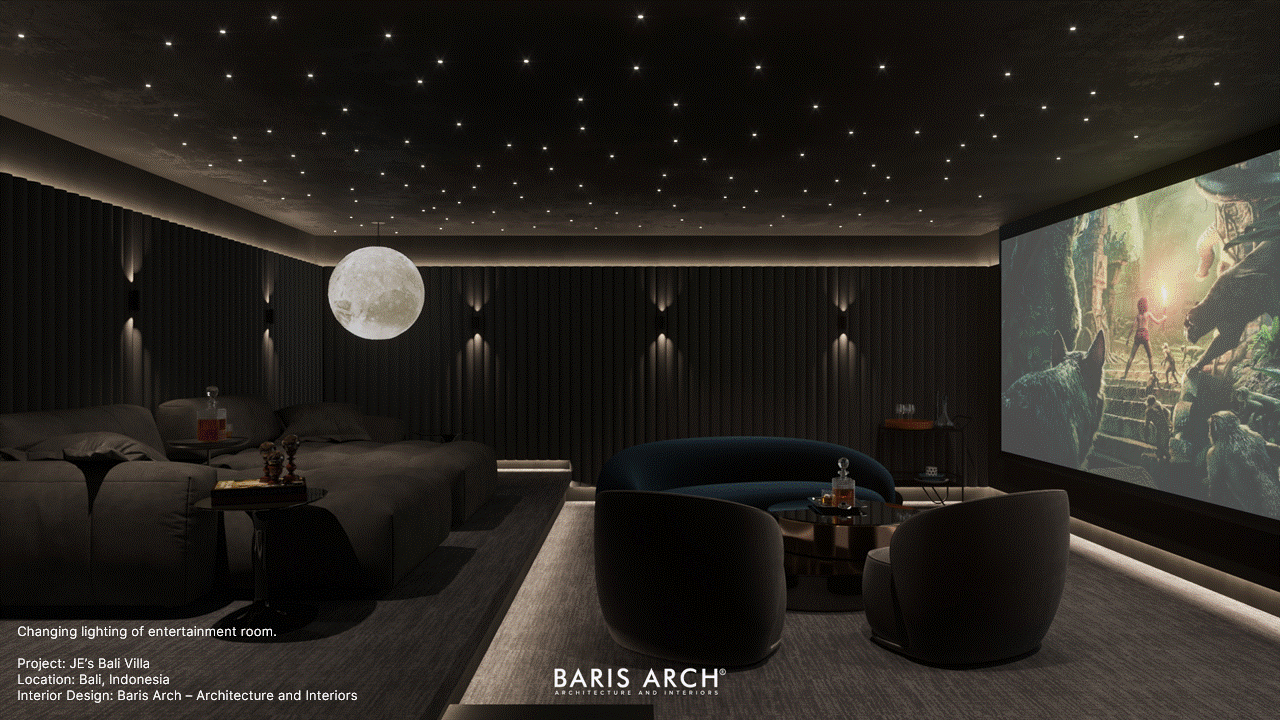 In this Villa project in Bali, Baris Arch has the opportunity to challenge with the theme of a modern and sophisticated entertainment room for a family of many members. The lighting set up in JE's Bali Villa's cinema room can be changed to create maximum entertaining feeling with two color modes like being in a real movie theater. The ceiling light is inspired by the starry night sky and the simple, smooth cubic furniture helps the family to have a wonderful relaxing time.