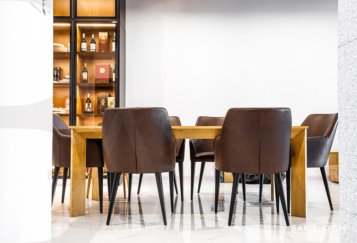 Song song với mạch gỗ, các vật liệu như đá cẩm thạch, đá băm, đá tổ ong và kính được Baris Arch điều phối, thêm nếm để đưa yếu tố tự nhiên vào không gian sống. Phòng sinh hoạt chung là sự hòa trộn của truyền thống với nét Việt phảng phất qua chiếc quạt trần hay cái ghế mây, kết hợp với lối thiết kế hiện đại, kiến tạo một không gian phù hợp cho mọi thành viên trong gia đình. Sàn ốp đá hoa cương trắng xen kẽ khung lam gỗ walnut sẫm màu càng tăng thêm không khí trầm ấm cho cả không gian.