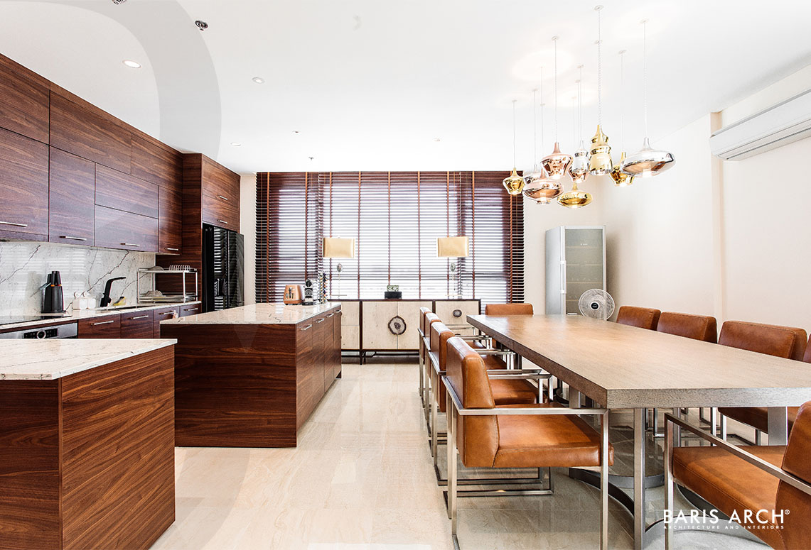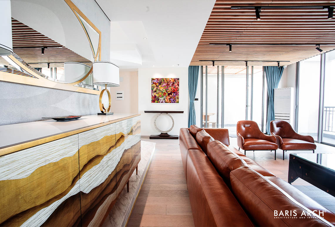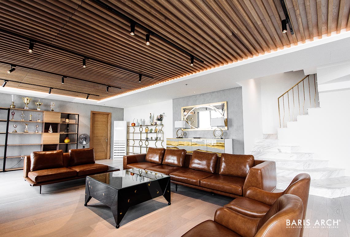 Huyết mạch của căn biệt thự như chảy tràn và thấm đẫm trong chất rượu vang đỏ đằm thắm mà sang trọng, tinh tế mà đê mê. Gỗ và đá hoa cương được thay phiên sử dụng dựa trên tính thẩm mỹ và trang trí hơn là thuần túy ứng dụng. Chính bởi luồng nội thất đa chất liệu làm tổng thể các gian phòng chính như phòng khách, nhà bếp, phòng ăn, phòng ngủ trở nên cầu kỳ, xa hoa hơn thường lệ. Baris Arch đã rất tâm huyết trong việc chắt lọc hoa văn và màu sắc của các vật dụng, để chúng vừa bổ trợ, vừa hài hoà lẫn nhau.