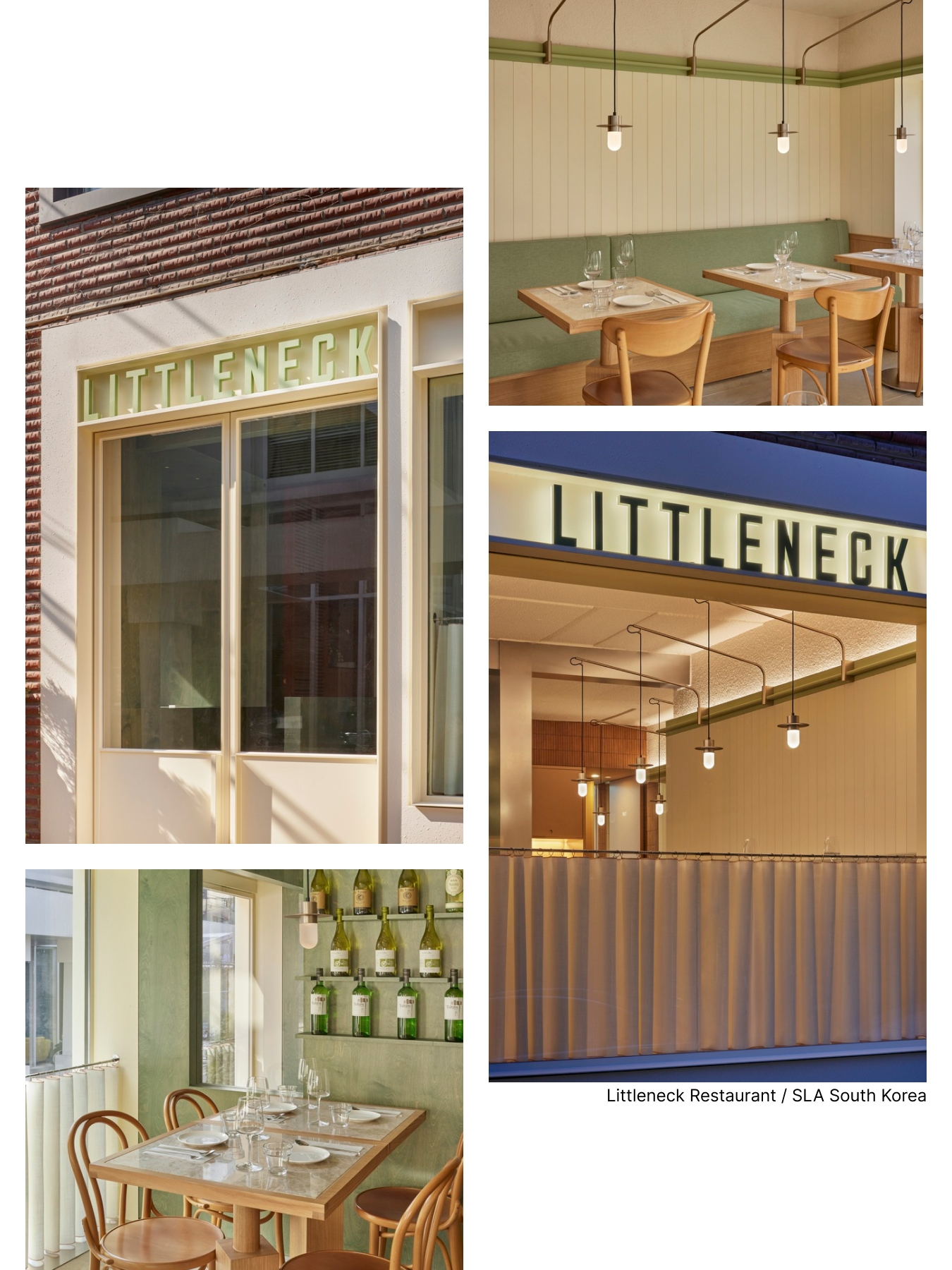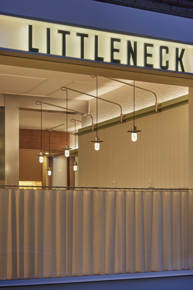 Sự tương phản giữa vật liệu mới và ánh sáng được thiết kế linh hoạt đã tạo ra những góc nhìn năng động cho không gian nhà hàng có diện tích hạn chế. Bên cạnh trải nghiệm ăn uống, thông qua không gian được thiết kế mới mẻ, nhà hàng Littleneck còn mang đến cho thực khách niềm vui khám phá các chi tiết thiết kế ẩn mình sau những tầng ánh sáng, thoắt ẩn thoắt hiện trong không gian.