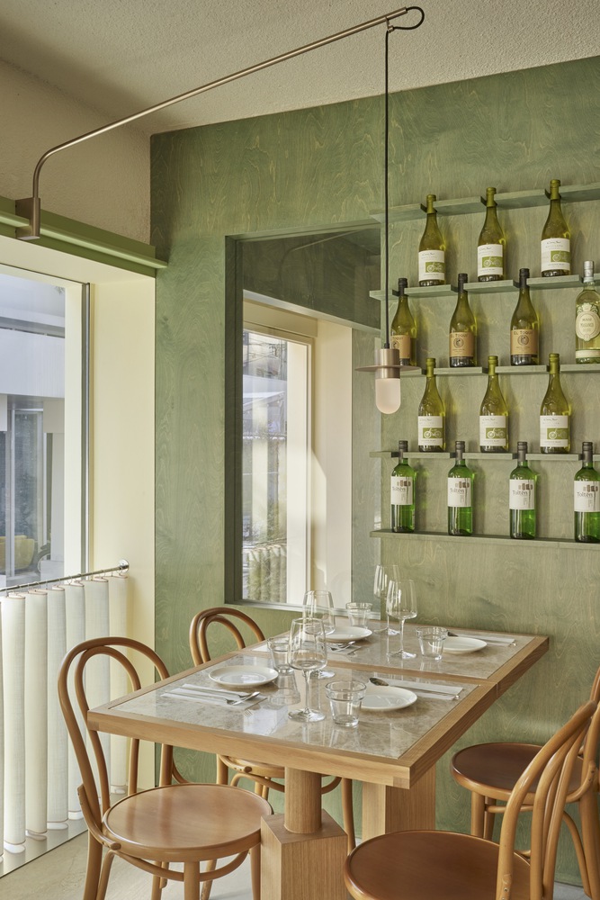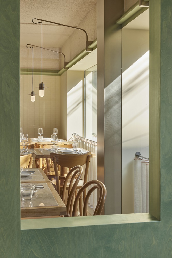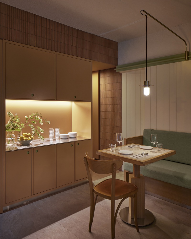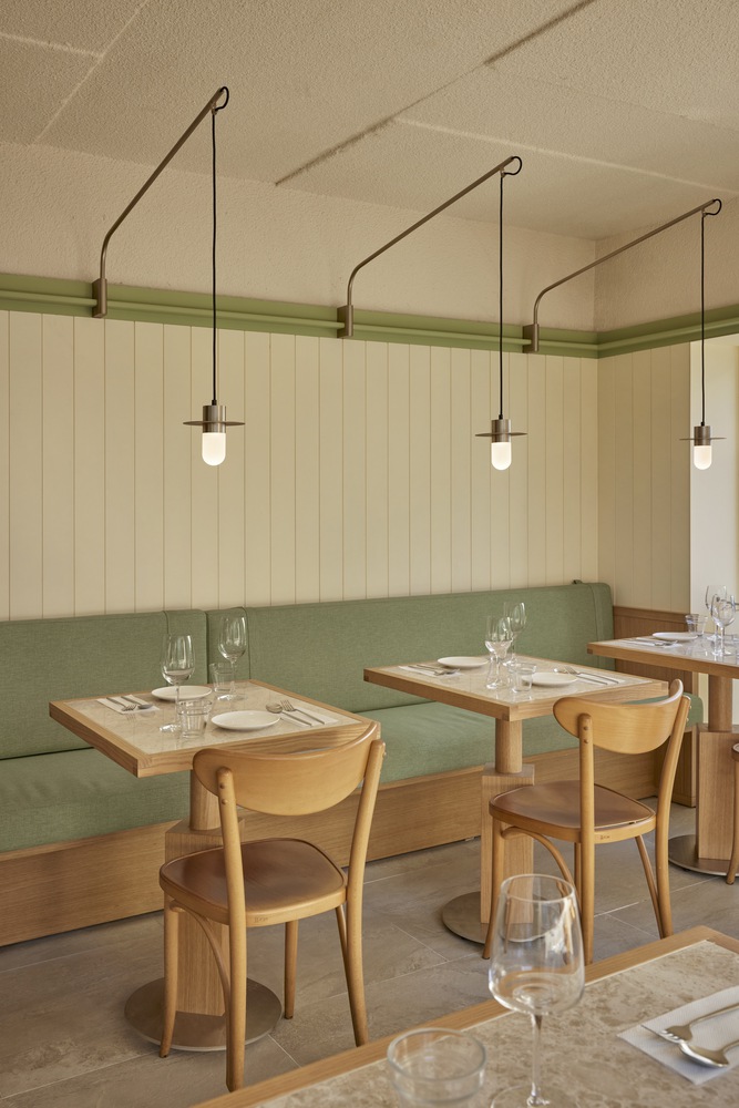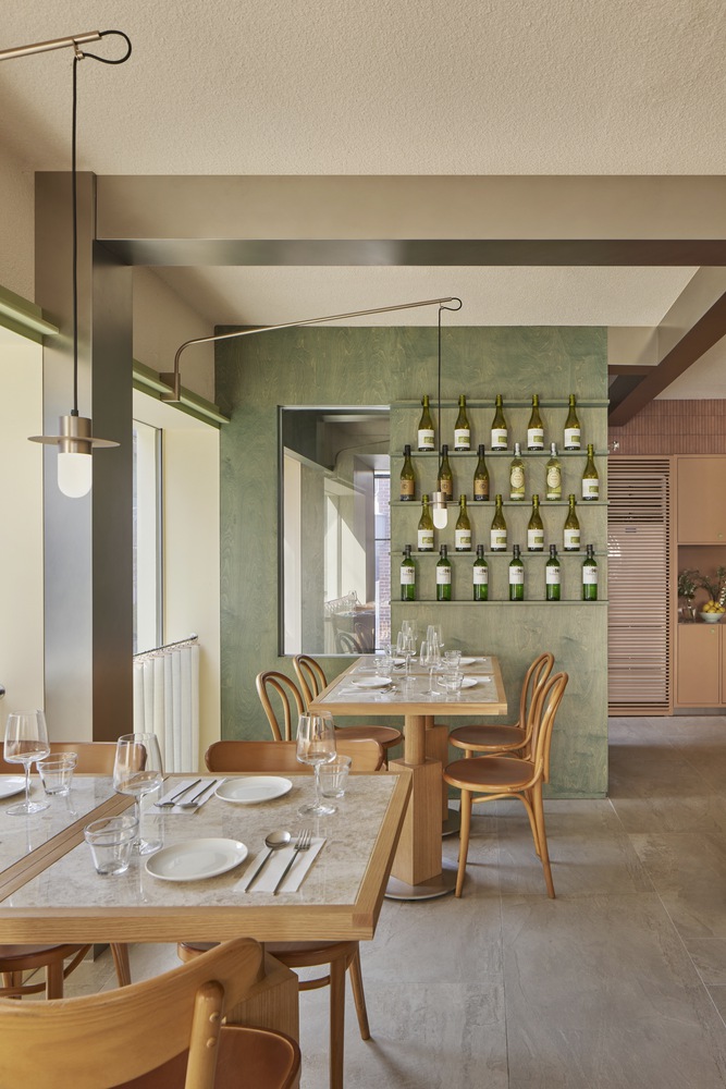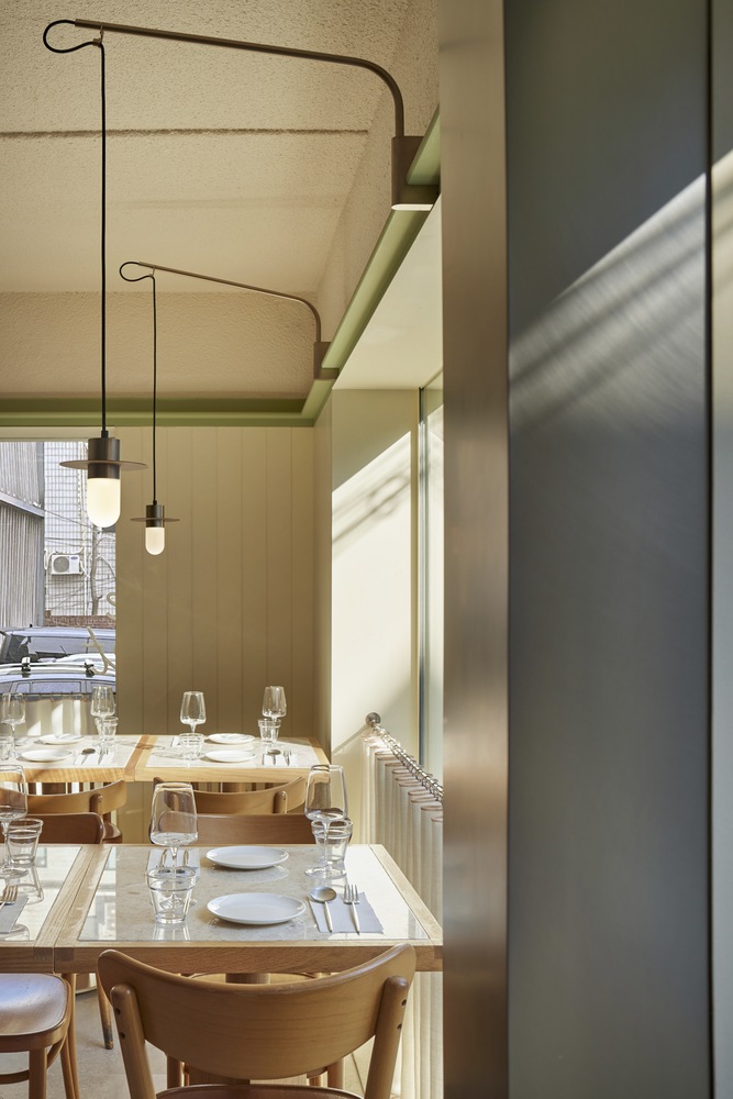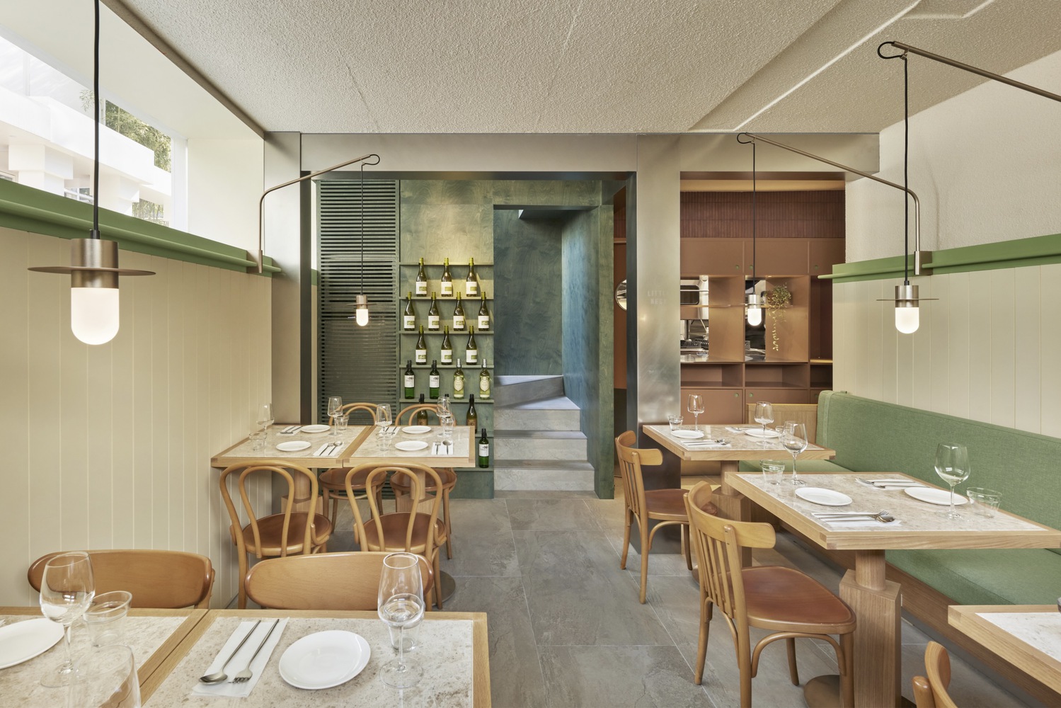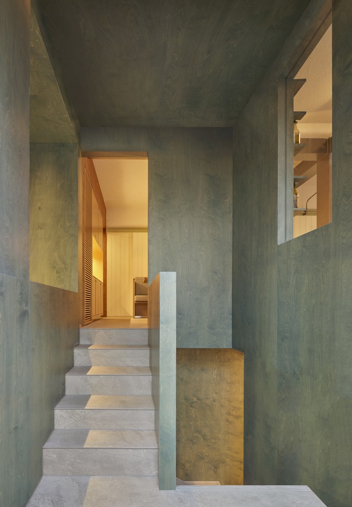 Khi bước vào cửa chính, khách hàng có thể cảm nhận ngay được cảm giác thân mật. Giống như một nơi trú ẩn, trong không gian của những bức tường gỗ bạch dương nhuộm xanh thủ công như bức màn che, lấp ló không gian nội thất qua khe hở. Đi qua cầu thang, người ta bước vào không gian chính, được hoàn thiện bằng gạch đất nung thô. Sau đó đến phòng ăn, nơi vật liệu chuyển dần sang gam màu sáng hơn và cởi mở hơn, cho phép khách giao tiếp cởi mở hơn.