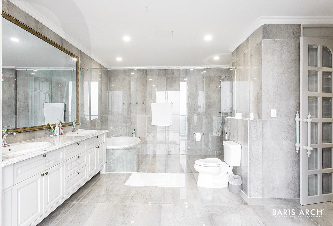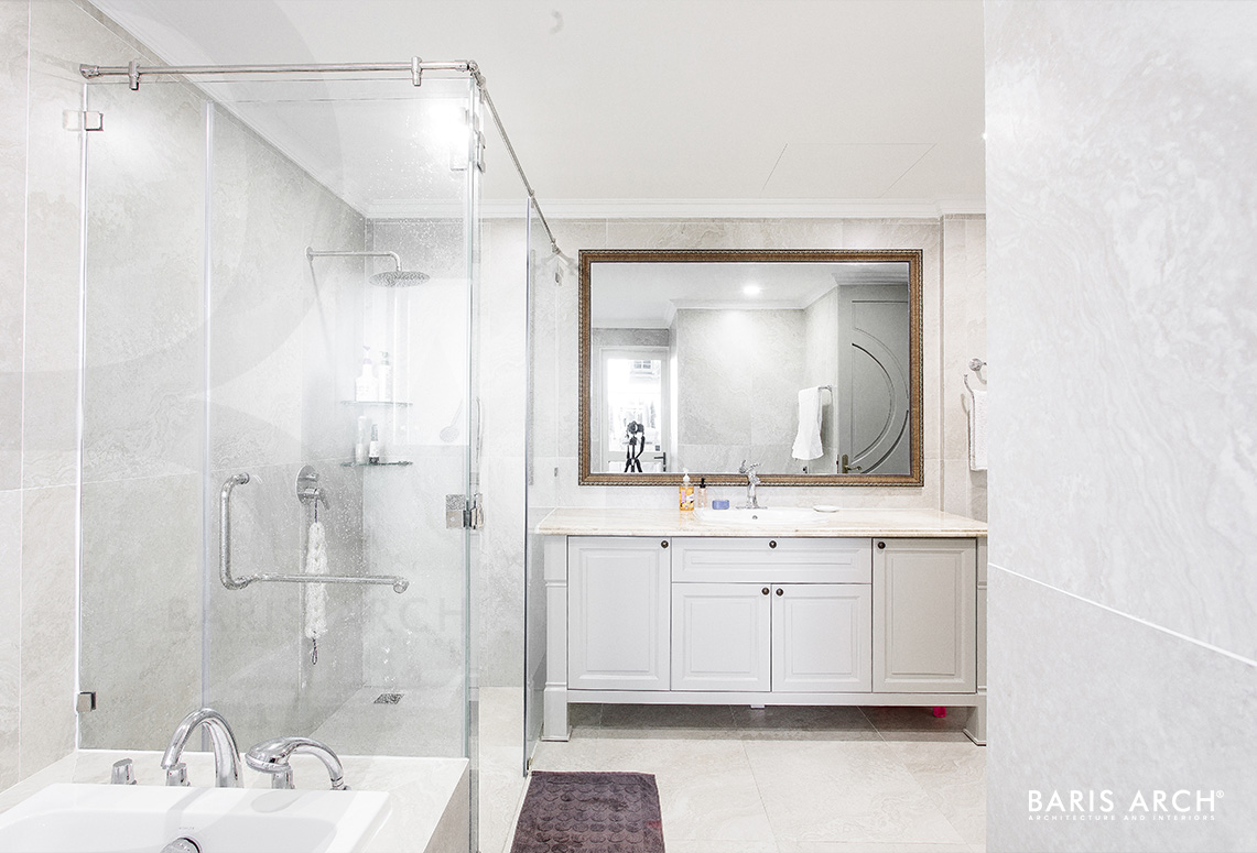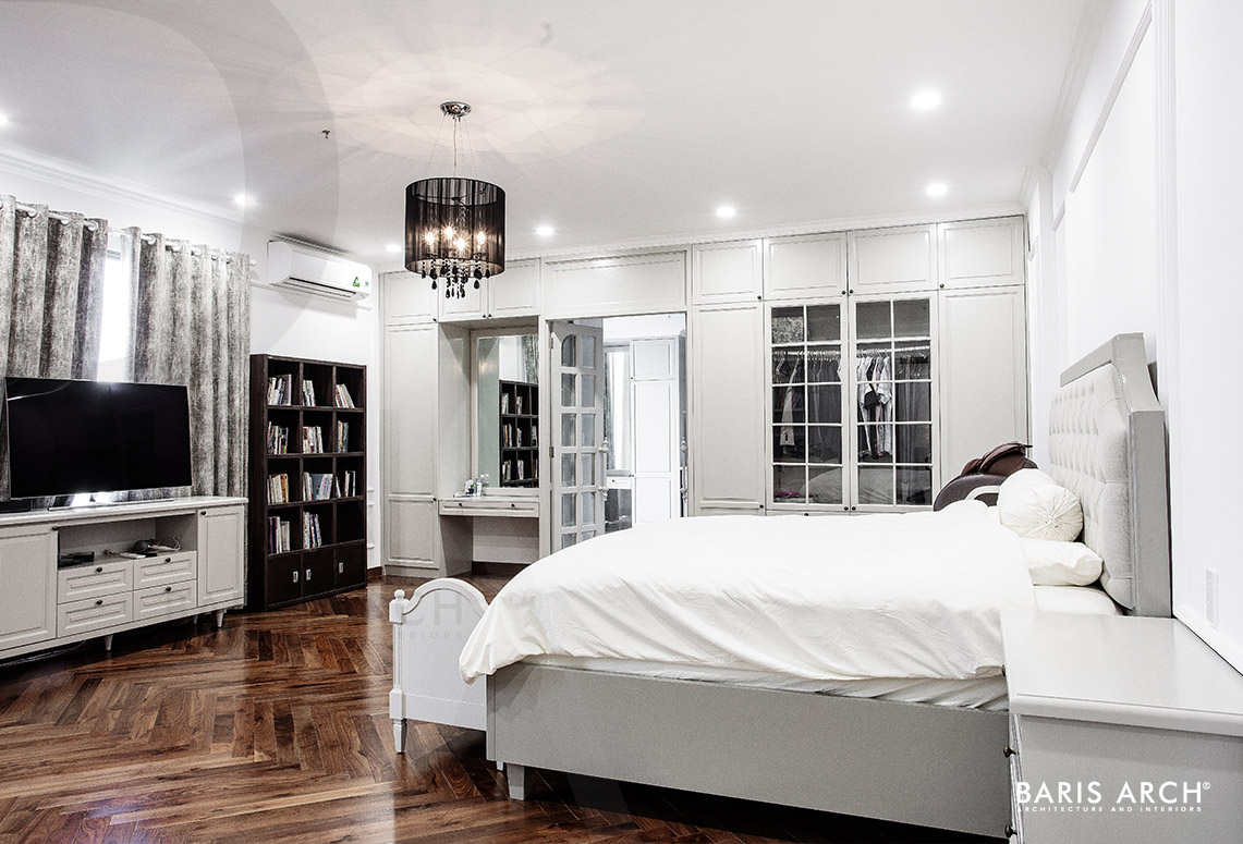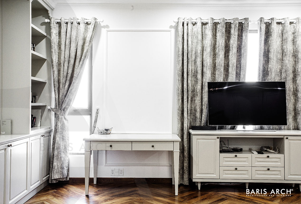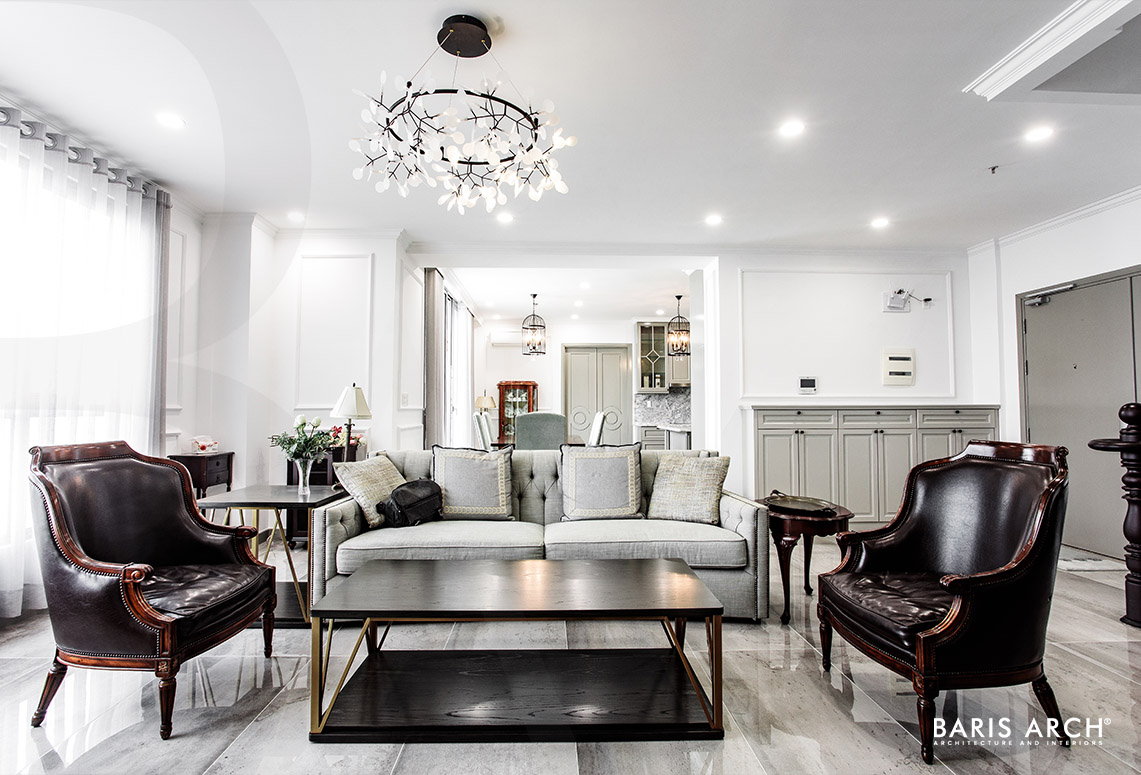 Mực thước trong màu trắng bật tông, căn nhà như rực sáng trong thiết kế truyền cảm hứng từ trào lưu tân cổ điển vốn nổi trội từ thế kỷ XVIII-XIX. Bảng màu trung tính gọn gàng trong ba sắc chính (đen, trắng, xám) tôn dáng hình thiết kế. Điểm nhấn của căn hộ nằm ở các hoa văn, họa tiết chọn lọc trên các vật dụng nội thất từ ghế đến cửa, tuy giản đơn nhưng thống nhất và đồng điệu.