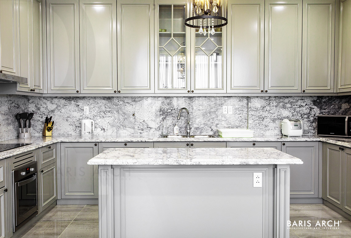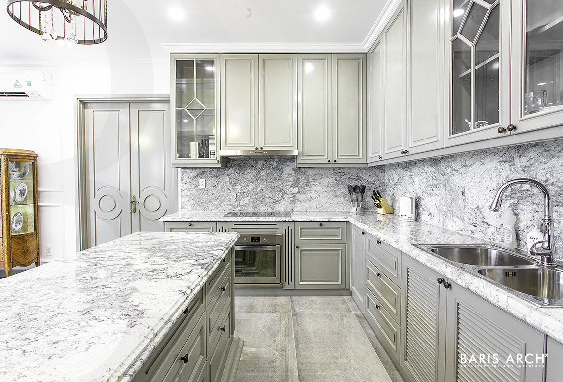 Với tính ứng dụng khá cao, nhà bếp và phòng ăn liên kết chặt chẽ trong chuyển động vòng tròn của màu sắc. Sắc xám bọc ghế trùng lắp với tông màu tự nhiên của đá cẩm thạch xám ở nhà bếp, và ngược lại, tông ngà của phần kệ gỗ lại rất hài hòa với sắc gỗ tự nhiên của bàn ăn. Sự tinh tế của sắc vàng ở tủ chén và tay nắm cửa dù rất khiêm nhường về diện tích nhưng là điểm rơi thị giác của căn phòng.