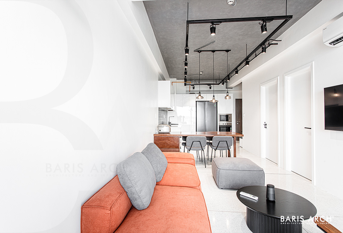 Phòng khách được thiết kế theo phong cách hiện đại tối giản, ít rườm rà nhưng vẫn toát lên vẻ đẹp, sự tinh tế và trang nhã của căn phòng trong gam màu trắng chủ đạo và gần như không sở hữu một vách ngăn chính thức nào nhằm bảo toàn tinh thần không gian mở. Bên cạnh đó, thiết kế trần mở hiệu ứng bê tông tăng cảm giác nới rộng không gian cho tổng thể căn hộ 70m2.