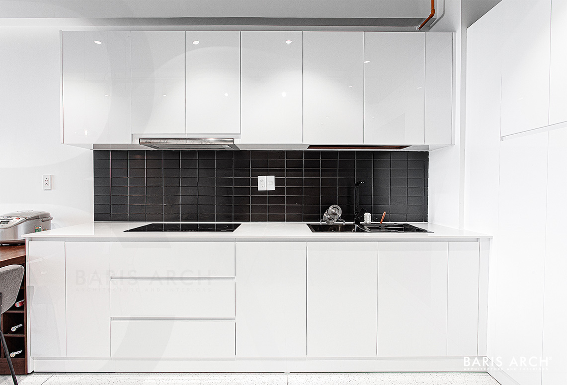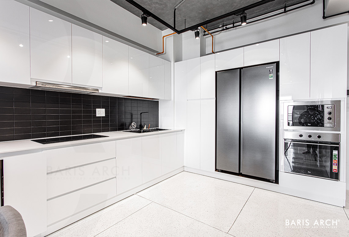 Nếu phòng khách được điểm xuyến bởi hệ thống đèn trần sang trọng soi những tia ấm áp xuống bộ sofa mềm mại thì khu vực bếp nổi bật hơn với với mảng tường gạch đen tuyền. Chất liệu gỗ, đá và kim loại được sử dụng một cách hợp lý để tạo điểm nhấn cho căn phòng, nhưng vẫn giữ được cảm giác nhẹ nhàng, thanh thoát của thiết kế.
