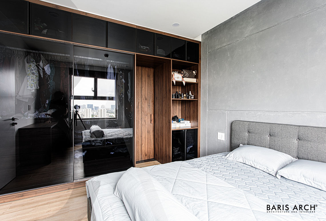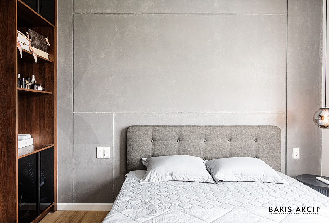 Không gian phòng ngủ Master mang tông màu trung tính, nhẹ nhàng được nhấn nhá phá cách với vách đầu giường hiệu ứng bê tông. Tủ quần áo với thiết kế kính trượt vừa tiết kiệm diện tích không gian, vừa làm điểm nhấn sang trọng cho tổng thể căn phòng. Ngoài ra khung cửa sổ lớn giúp tối ưu hóa nguồn sáng tự nhiên giúp bổ trợ hiệu quả cho không gian thiết kế đơn sắc.