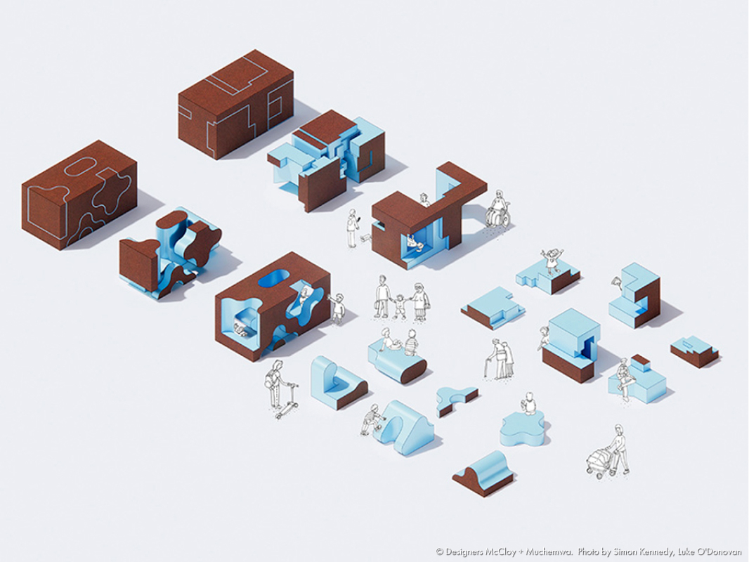 Có 2 loại mô-đun, một là loại có hình dạng và kích thước giống nhau như đồ chơi Lego, mô-đun có hình dạng và kích thước khác nhau. Mới đây, studio thiết kế McCloy + Muchemwa đã làm sống động khu vui chơi ngoài trời Urban Playground giữa lòng thành phố London với những khối mô-đun trừu tượng, đặc - rỗng đa dạng được làm từ vật liệu tái chế. Các khối được thể hiện vùng bên trong rộng rãi, mang lại giải nghiệm không gian khác biệt. Khi không được sử dụng như khu vui chơi, các khối mô-đun của Urban Playground trở thành những tác phẩm điêu khắc ngoài trời ấn tượng, tạo cảm hứng cho khu thương mại yên tĩnh giữa London.