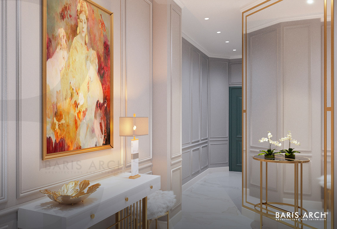 “Nhà của nàng thơ” ngay từ tiền sảnh đã cho người nhìn ấn tượng đầu tiên về kiểu cấu trúc Chấn hưng Thực dân (Colonial Revival) thế kỷ 18 tại các nước Bắc Mỹ thể hiện trong các đường chỉ tường chữ nhật cổ điển, các chi tiết mạ đồng sáng lóa và sàn đá liền mạch. Nhịp điệu vuông vức xuyên suốt trong hình dáng nội thất và tấm bình phong kính lớn hóa mềm mại nhờ các chi tiết mỏng nhẹ của khung tranh, các nét cắt gọn ghẽ của chân bàn, chân ghế và chất liệu đệm lông xù cho ghế chờ - những nốt nhạc đầu vang lên cho bản giao hưởng quyền quý, xa hoa trong phong cách. Tông xám của tường thổi vào không gian một cảm giác chậm rãi và điềm tĩnh, các quý cô đợi chờ đến lượt mình cũng ăn nói nhỏ nhẹ và cư xử nhã nhặn hơn.