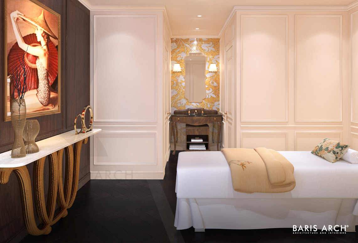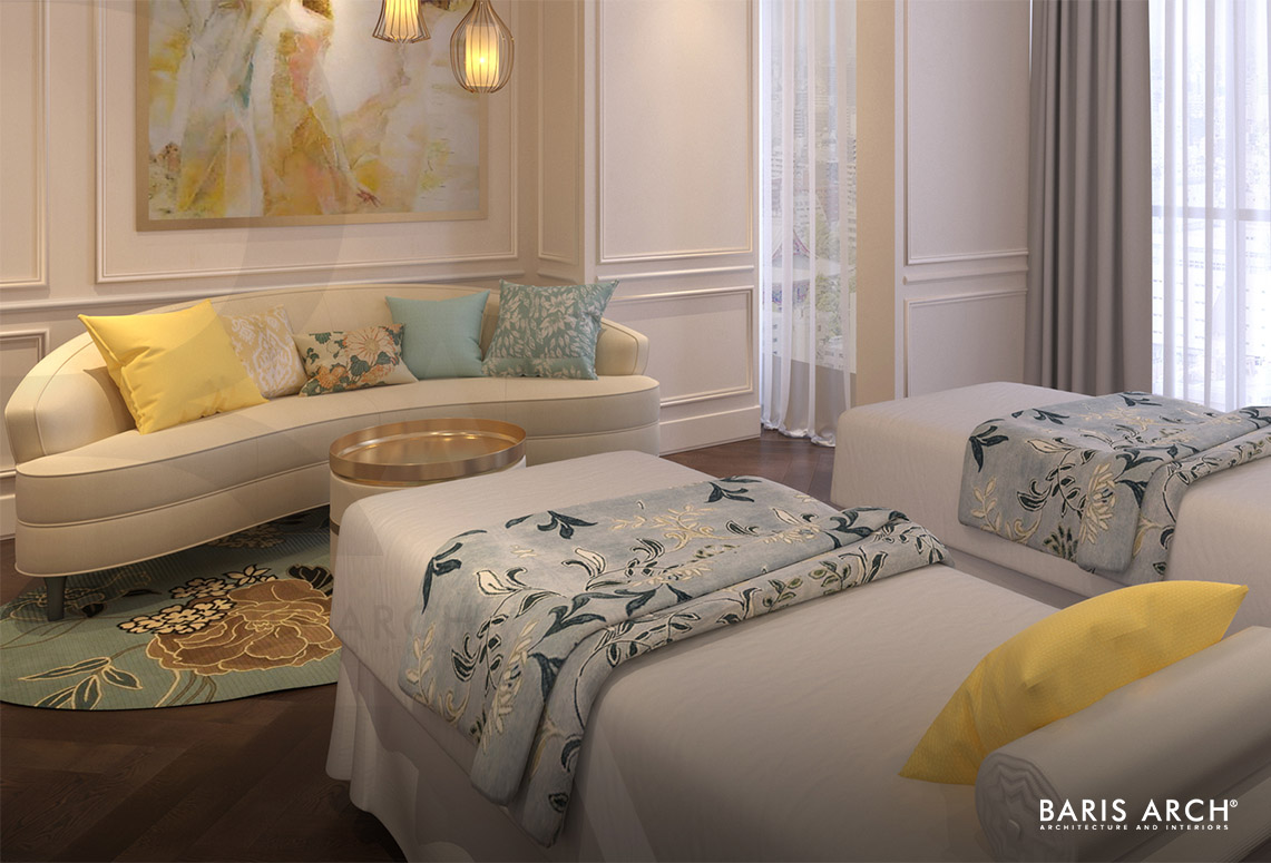 Các phòng dịch vụ riêng vừa đồng điệu và hài hòa trong bố cục vừa có dấu ấn riêng trong chi tiết. Mỗi phòng đều được cung cấp các vật dụng nội thất chức năng như giường spa, ghế sofa và bàn cà phê đáp ứng nhu cầu phục vụ khách hàng. Sắc trắng tinh khôi chủ đạo đem lại cảm giác ngăn nắp, sạch sẽ cho không gian nói chung và ảnh hưởng đến tâm lý khách hàng về dịch vụ nói riêng. Sắc trắng cũng là thủ pháp làm nền linh hoạt cho các biến tấu chi tiết, góp phần tôn tạo nét độc lập và cho phép sự đa dạng trong cách phối màu, chọn chủ đề mà không gây hỗn độn hay rối rắm.