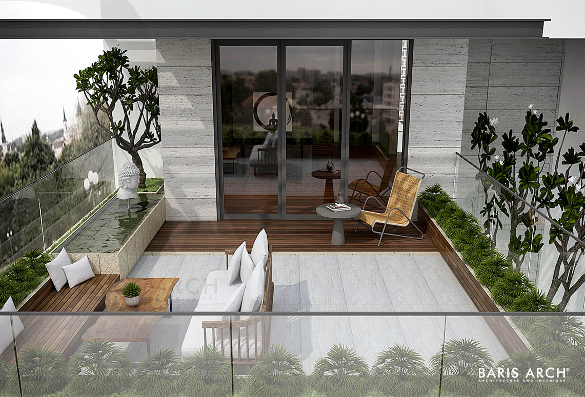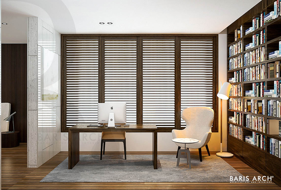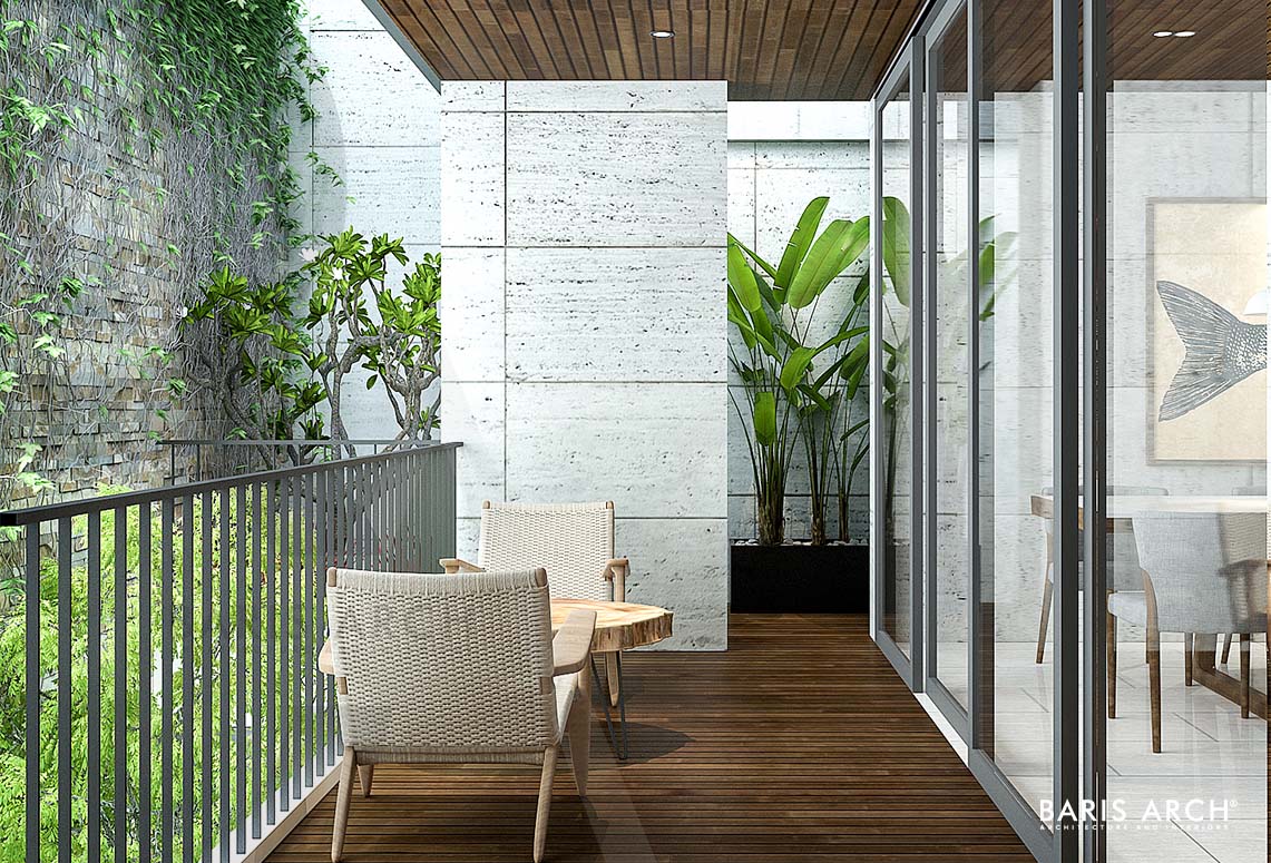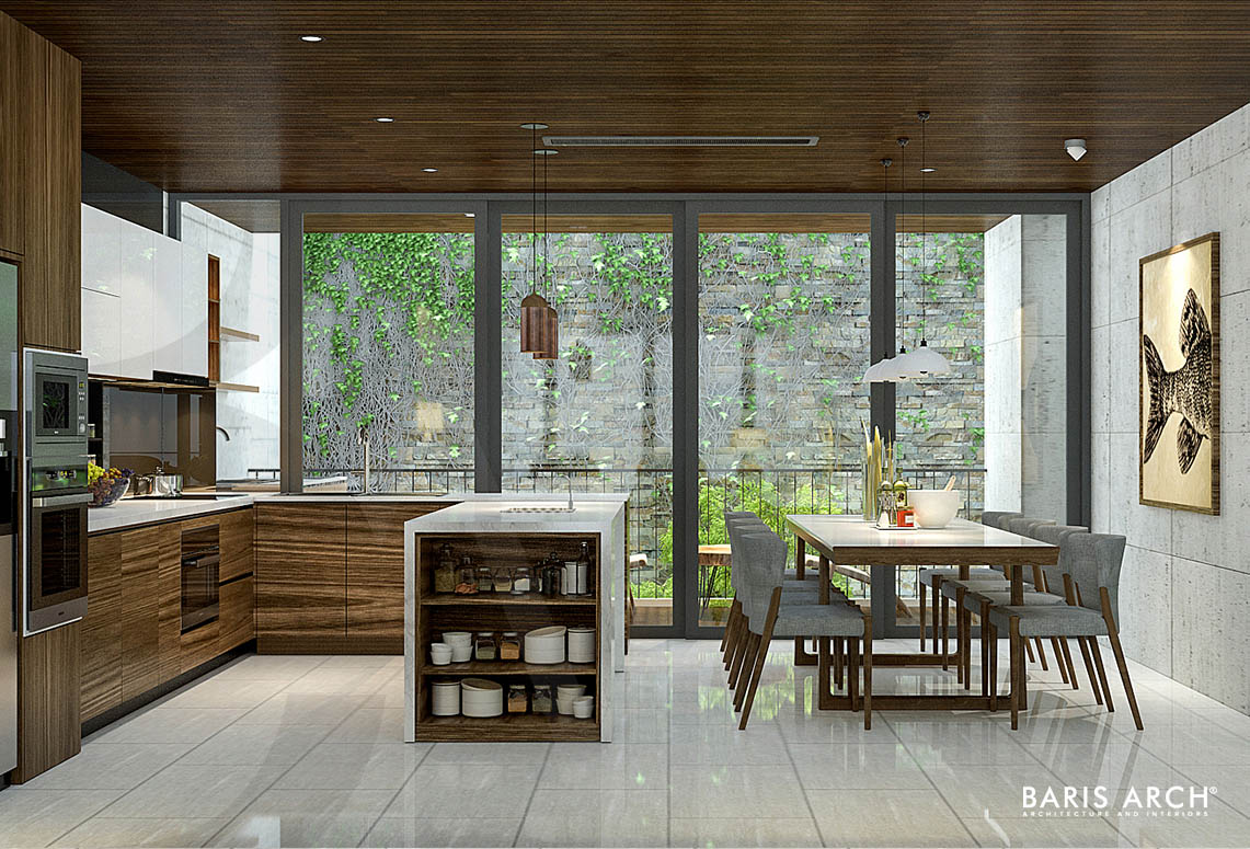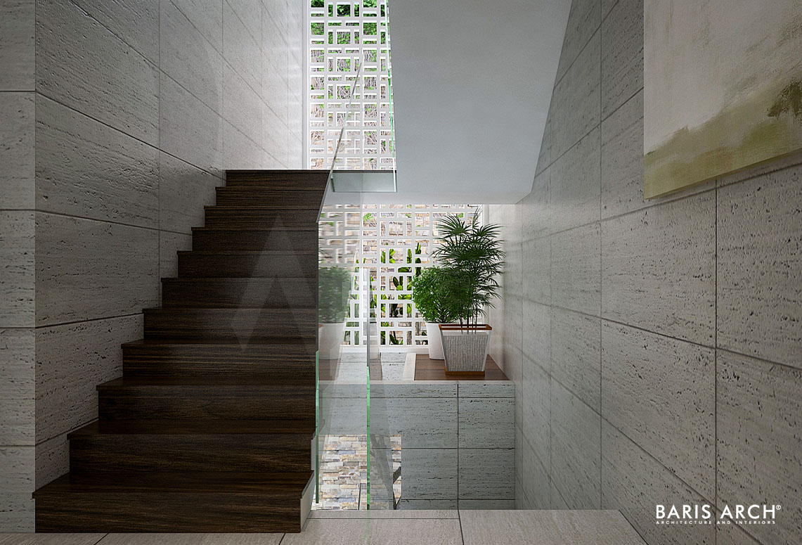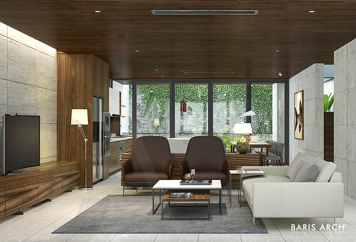 Mặt tiền của ngôi nhà là một ki-ốt với sàn lót gạch men, tầng trệt được nối liền với nhau bằng gỗ tự nhiên với lối thiết kế hình khối, tạo cảm giác cứng cáp và sang trọng cho căn nhà. Chủ nhân căn nhà này là một người yêu thiên nhiên, nên giải pháp đề ra cho các KTS của phải tạo được những khoảng trống tận dụng cho không gian xanh - mang màu xanh của tự nhiên vào bên trong ngôi nhà. Việc tận dụng tối đa lối kiến trúc mở giàu công năng mang lại cho ngôi nhà một sức sống mới hiện đại nhưng vẫn giữ được sự đơn giản cần có.
