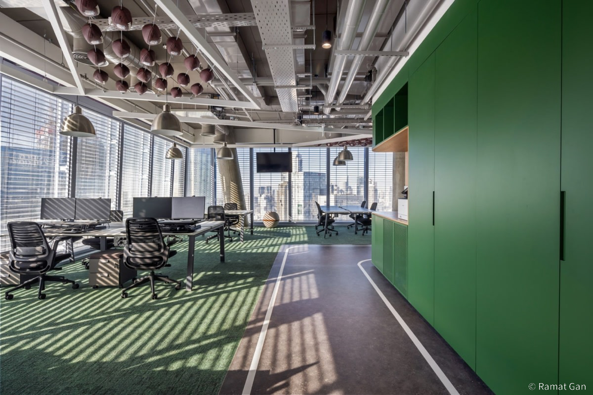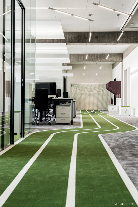 Sân cỏ nhân tạo là phương án đơn giản phù hợp để “làm quen” với không gian thể thao. Một đường chạy xanh xuyên suốt các khu vực giúp nhân viên có cảm hứng di chuyển, thêm một số “cột mốc” ghi nhận mức năng lượng hoặc vạch đích để tạo cảm giác “muốn chinh phục” hơn. Với hình thức này, chủ đầu tư có thể lựa chọn vật liệu thảm và sàn vinyl kết hợp để tiết kiệm chi phí và dễ dàng tạo đường cong.