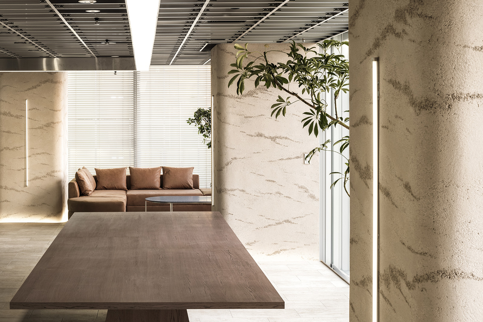 Bằng cách làm mờ ranh giới giữa hình ảnh và thực tế, I IN thể hiện công trình mang hơi hướng biểu tượng cho tương lai đích thực. Đối lập với không gian mở, phòng họp được bao quanh bởi một bức tường thạch cao với hình khối mềm mại và không gian căn phòng, thông qua thiết kế, đã thể hiện được rõ sự tĩnh lặng của nó.