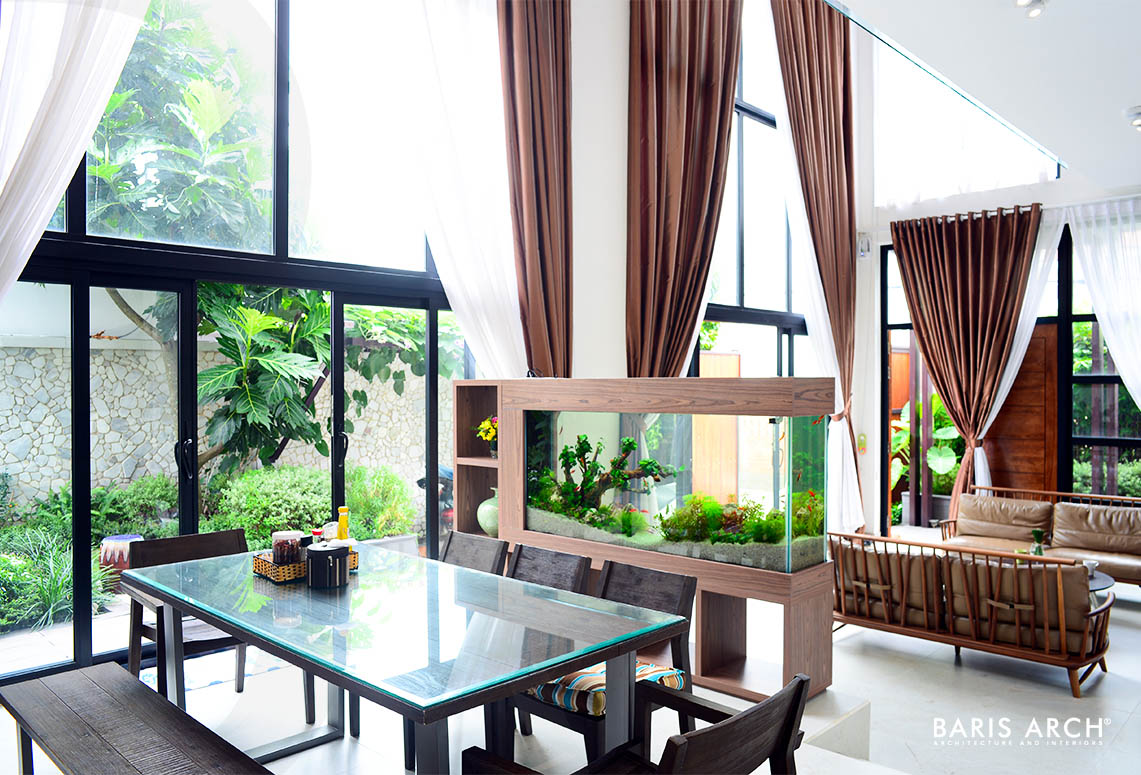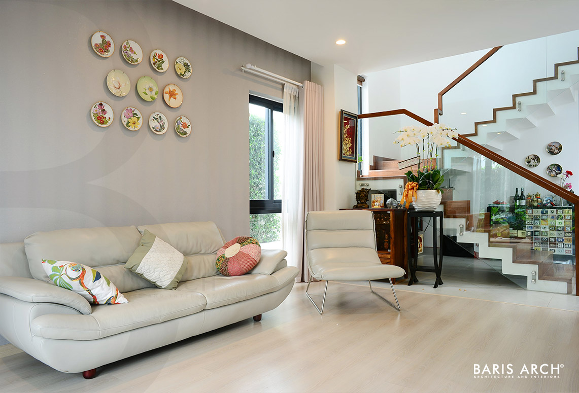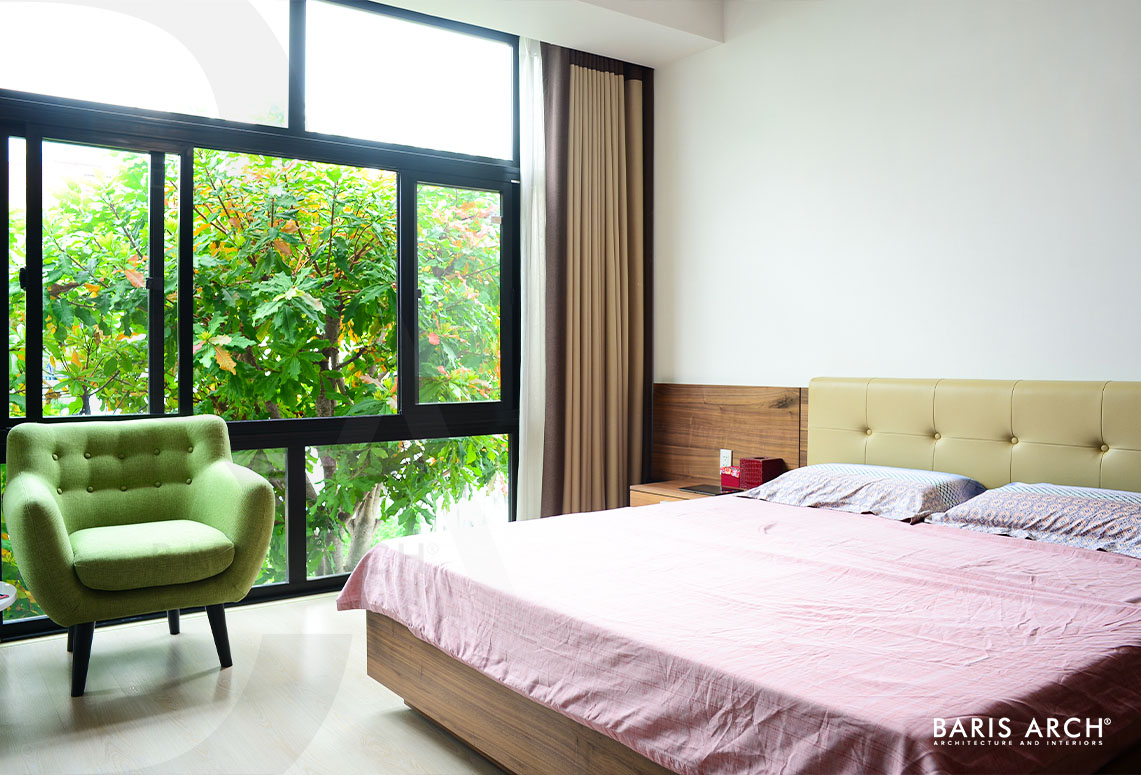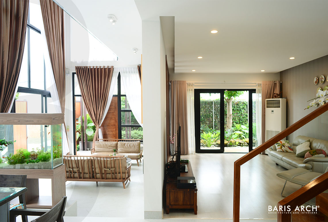 Ngoài việc chăm chút cho nội thất bên trong, phối cảnh sân vườn là một trong những ưu tiên hàng đầu để làm dịu cái nóng khô rang của vùng Ninh Thuận đầy nắng. Những cửa kính gấp mở tối đa cho chủ nhà khi cần thiết, kết nối các khối chức năng vào trong một không gian lớn.