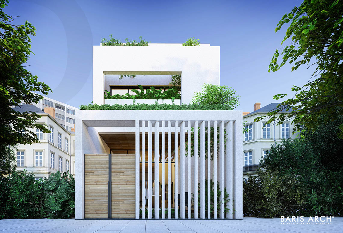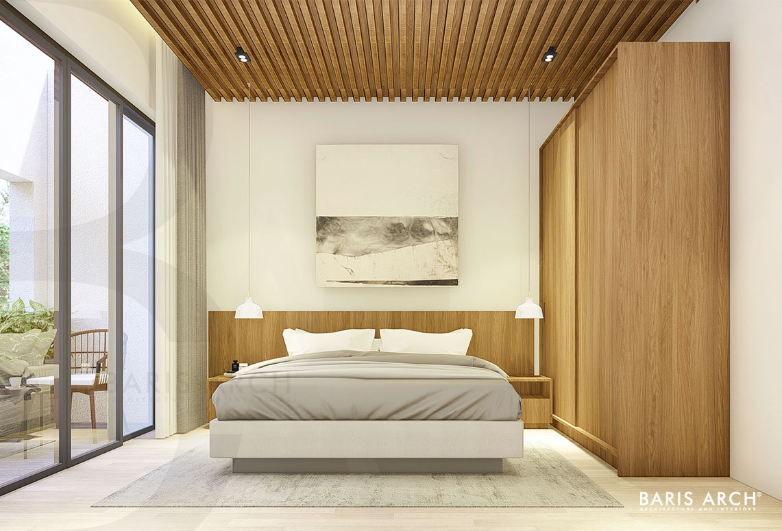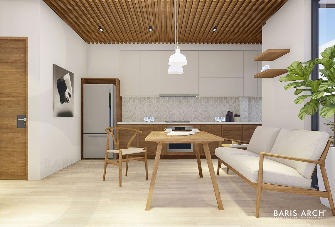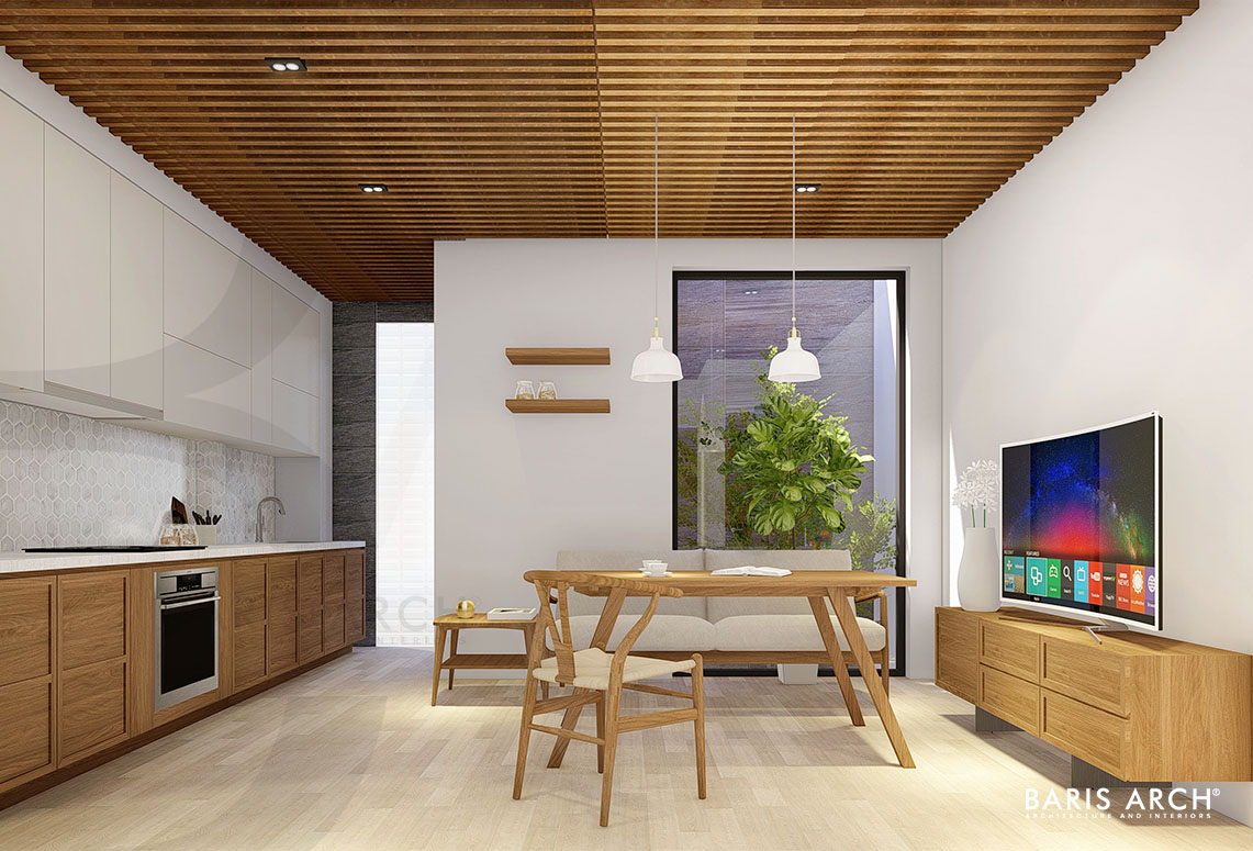 Sàn nhà được lát bằng gỗ tự nhiên, nội thất mang dáng hình vuông vức nhưng không gian chẳng hề giăng mắc chút xíu nhàm chán, u hoài nhờ vào khoảng sân trong lan toả đầy nắng. Sự cân nhắc thông minh và sáng tạo của kiến trúc sư thể hiện ở cách phân bổ tầm nhìn hướng về khoảng sân xanh, tạo nên một ốc đảo yên tịnh và thư thái giữa nhịp sống đô thị hối hả ở ngoài xa. Với cách xây dựng hình khối, tinh giản những chi tiết thừa thãi, tận dụng tối đa khoảng trống đã tạo nên một công trình mang hơi thở của thiên nhiên với công năng hữu ích nhằm mang lại chất lượng cuộc sống tốt nhất cho người sử dụng.